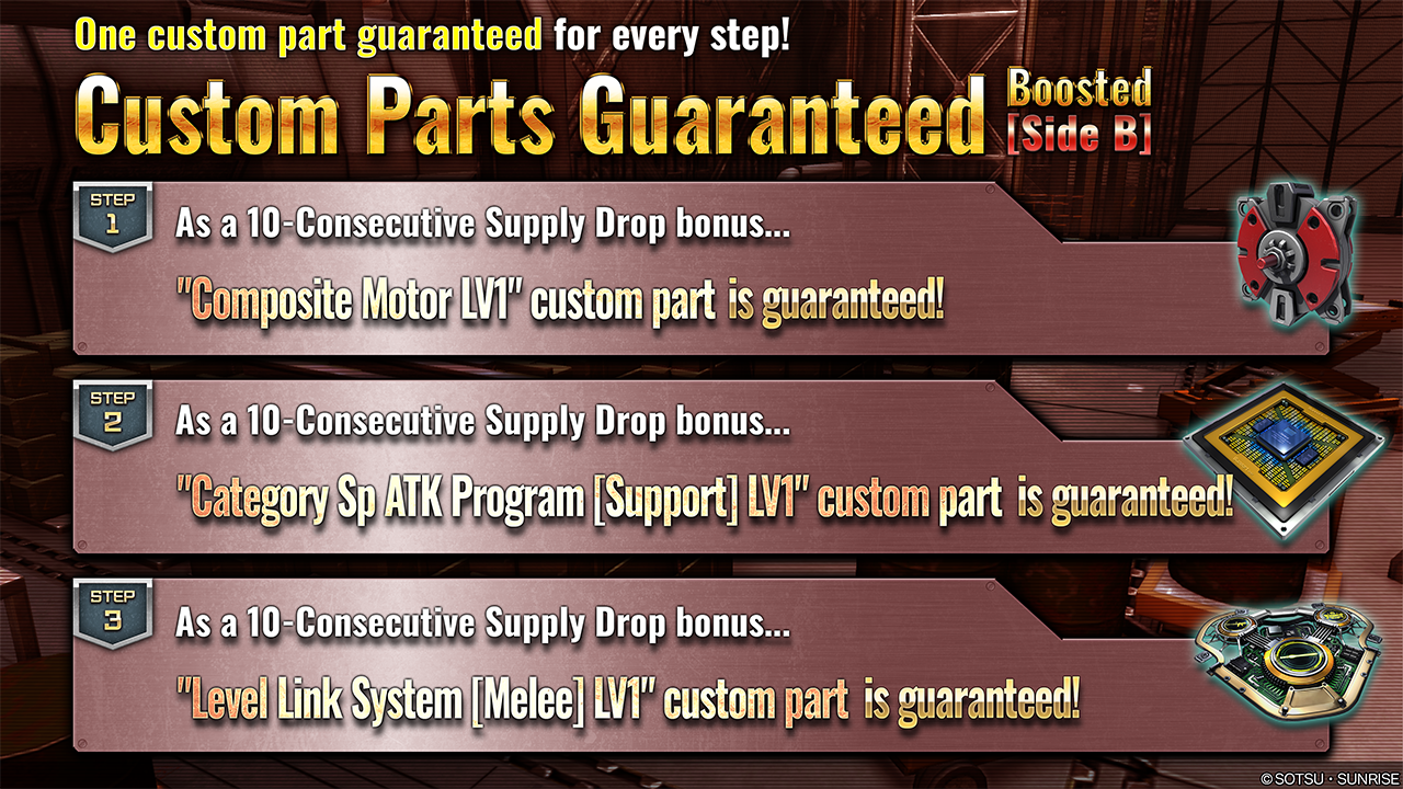 ■Content A Supply Drop, in which 10 consecutive Supply Drops can be requested up to STEP3. The STEP will progress by 1 each time you perform a request, as STEP1 → STEP2 → STEP3. Once you reach STEP3, the Boosted Supply Drop will end. ・STEP1 (30 Tokens): Custom part “Composite Armor [Type-B] LV1” for bonus! ・STEP2 (30 Tokens): Custom part “Category Sp ATK Program [General] LV1” for bonus! ・STEP3 (30 Tokens): Custom part “Level Link System [Ranged] LV1” for bonus!