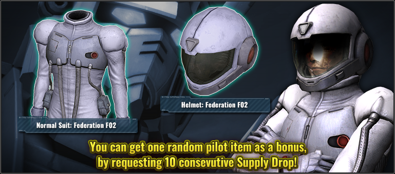 ■Bonus Item Contents (get 1 of the 2 items randomly listed below) ■Wear Normal Suit: Federation F02 ■Accessory Helmet: Federation F02 ※Requesting 10-Consecutive Supply Drops during the campaign will grant you an additional 11th supply drop, and get 1 extra item. ※Single Supply Drop is NOT applied with this benefit. The bonus item will not be awarded even if you request the 1-Attempt Supply Drop ten times in a row.