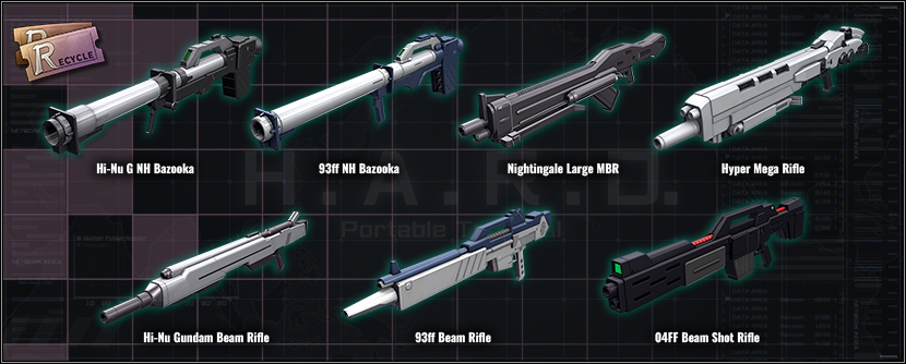 ■New Materials for exchange are added to Recycle Counter. ⇒ Information about newly added materials ■Main weapons ・★★★ Hi-Nu G NH Bazooka LV1–2 added ・★★★ 93ff NH Bazooka LV1–2 added ・★★★ Nightingale Large MBR LV2 added ・★★★ Hyper Mega Rifle LV2 added ・★★ Hi-Nu Gundam Beam Rifle LV2 added ・★★ Hi-Nu Gundam Beam Saber LV2 added ・★★ 93ff Beam Rifle LV2 added ・★★ 93ff Beam Saber LV2 added ・★★ 04FF Beam Shot Rifle LV2 added ・★★ 04FF Beam Saber LV2 added ・★★ Nightingale B Tomahawk LV2 added ※The materials mentioned above will be available at the Recycle Counter, from [JST] 01/01/2026 – 01/08/2026.