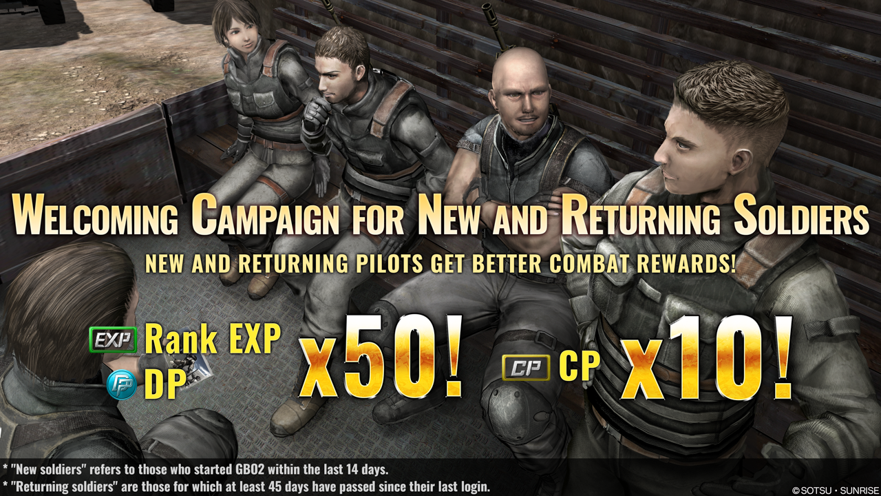 ■Content During the event, both new and the returning pilots will receive basic rewards like Rank EXP and DP for 50x, and CP for 10x! New pilot: Started GBO2 within the last 14 days Returning pilot: Has not logged in GBO2 for 45 days or more
