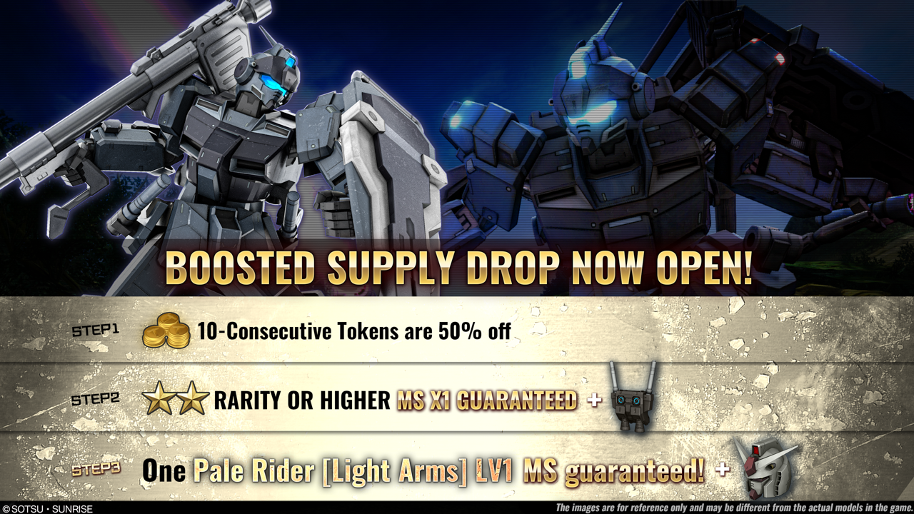 ■Content A Supply Drop, in which 10 consecutive Supply Drops can be requested up to STEP3. The STEP will progress by 1 each time you perform a request, as STEP1 → STEP2 → STEP3. Once you reach STEP3, the Boosted Supply Drop will end. ・STEP1 (15 Tokens): Tokens 50% OFF! ・STEP2 (30 Tokens): ★★ rarity or higher MS x1 guaranteed!! + Accessory "Backpack: Gundam" for bonus! ・STEP3 (30 Tokens): "Pale Rider [Light Arms]" x1 guaranteed! + Accessory "Mask: Gundam" for bonus!