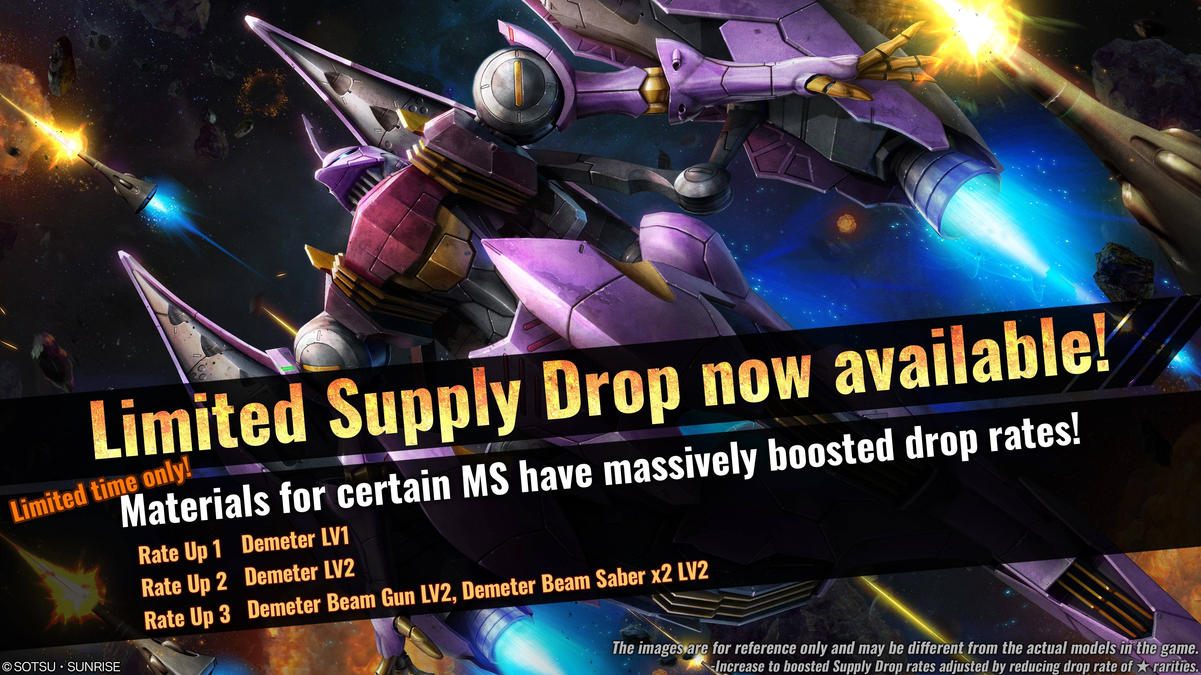 ■Featured material with a Big Boost to its supply drop rate In the Limited Supply Drop, drop rate on each unit LV and weapon will be affected respectively. ◎Supply drop rate increase① (Item Amount 1) ・★★★★ Demeter LV1 (Raid unit, ground/space uses, cost: 650) ◎Supply drop rate increase② (Item Amount 1) ・★★★★ Demeter LV2 (Raid unit, ground/space uses, cost: 700) ◎Supply drop rate increase③ (Item Amount 2) ・★★ Demeter Beam Gun LV2 ・★ Demeter Beam Saber x2 LV2