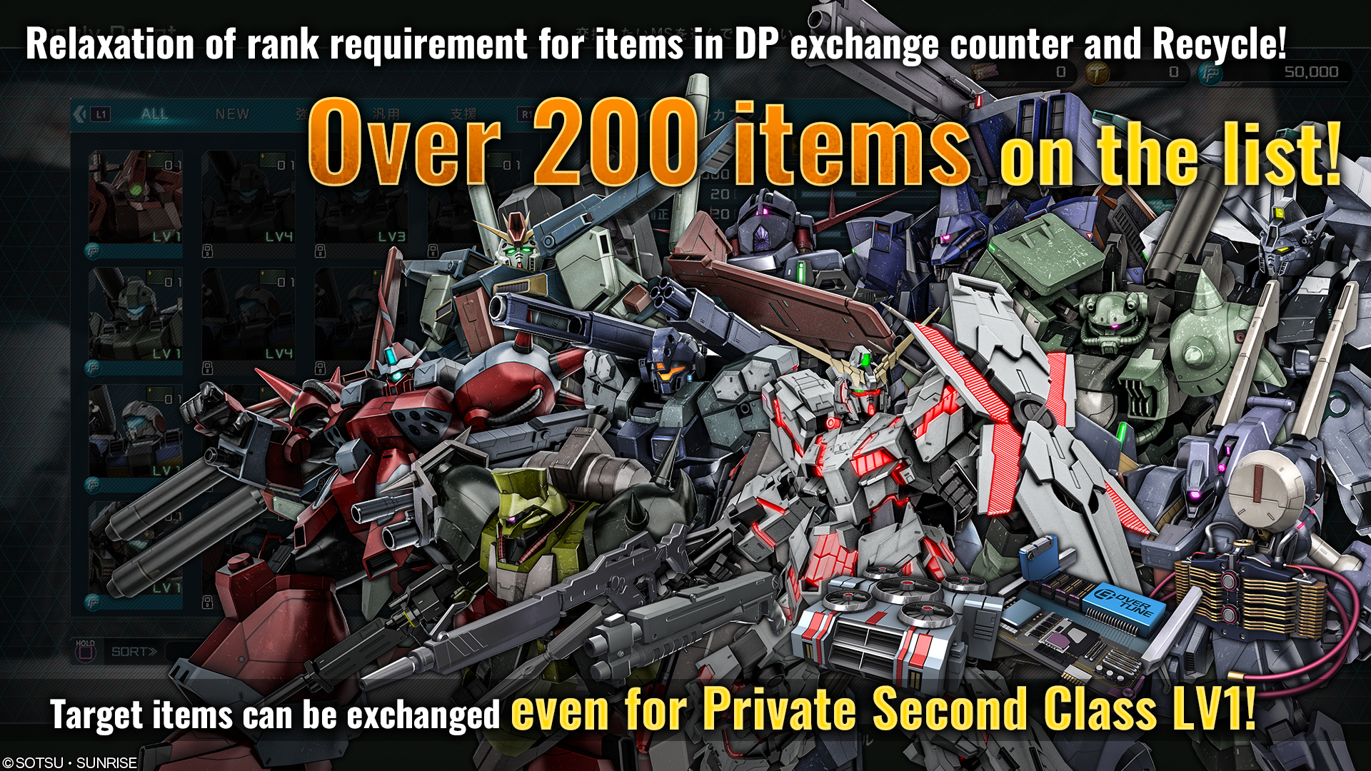 ■New Materials for exchange are added to DP exchange Counter. ⇒ Information about newly added materials ■Units ・★★★ Gaplant TR-5 LV1–2 added ・★★★ Gelgoog Vertex Kyanos LV2 added ・★★★ Gelgoog Vertex Xanthos LV2 added ・★★★ FA Gundam Mk-II LV3 added