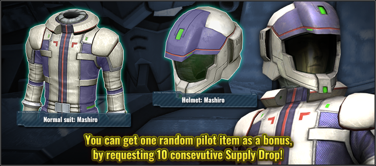 ■Bonus Item Contents (get 1 of the 2 items randomly listed below) ■Wear Normal Suit: Federation 02 ■Accessory Helmet: Federation 02 ※Requesting 10-Consecutive Supply Drops during the campaign will grant you an additional 11th supply drop, and get 1 extra item. ※Single Supply Drop is NOT applied with this benefit. The bonus item will not be awarded even if you request the 1-Attempt Supply Drop ten times in a row.