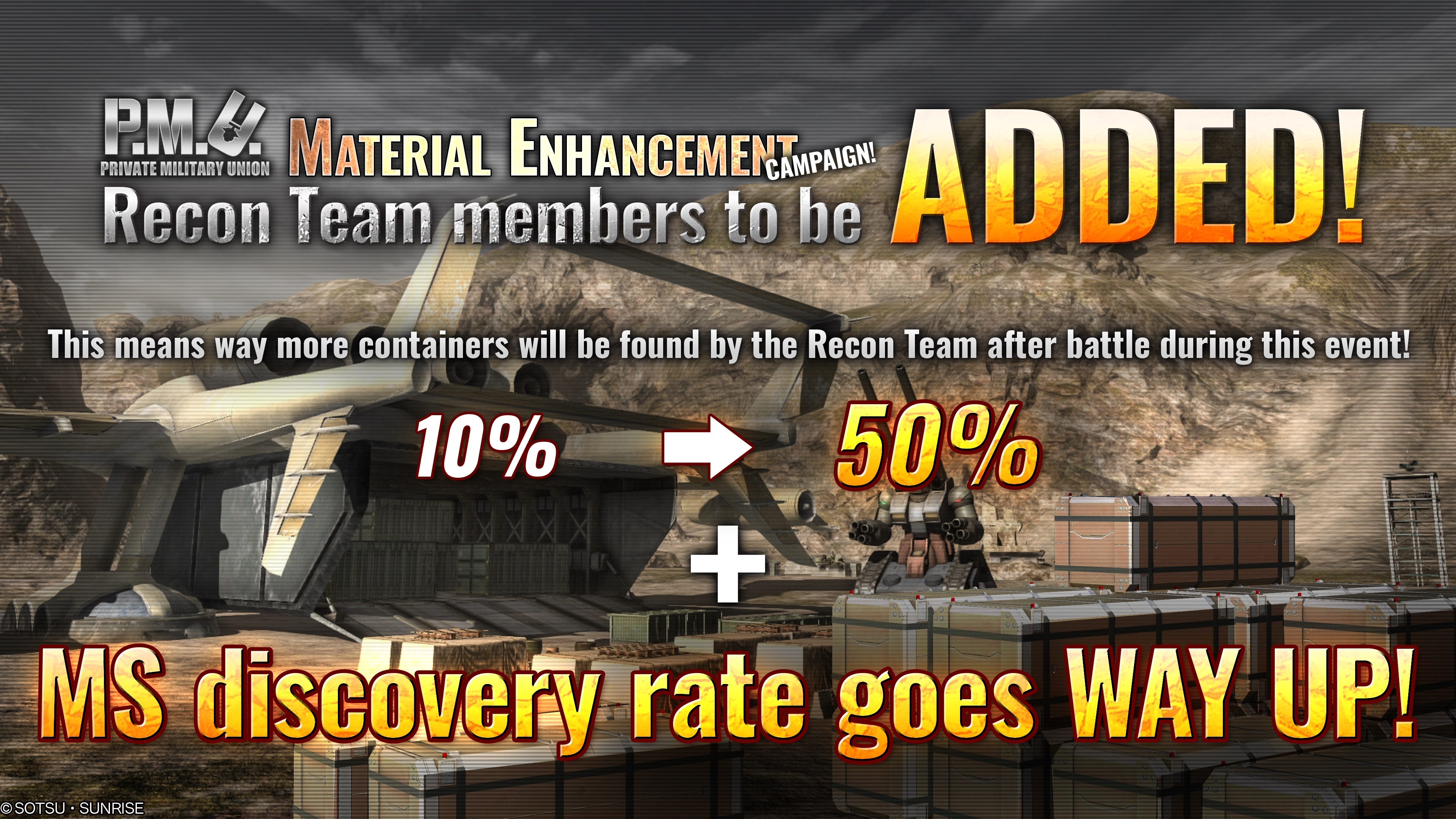 ■P.M.U. Material Enhancement Campaign ③: Reinforced container recon team During the period, container discovering chance after the battle will be increased from “10%” to “50%”. There is more! The MS discovery rate from the container will also be greatly boosted!