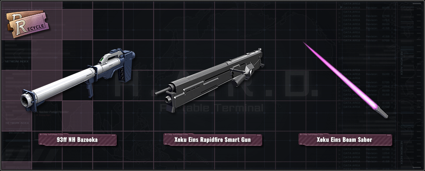 ■Main weapons ・★★★ 93ff NH Bazooka LV1 added ・★★ Xeku Eins Rapidfire Smart Gun LV2 added ・★ Xeku Eins Beam Saber LV2 added ※The materials mentioned above will be available at the Recycle Counter, from [JST] 01/29/2026 – 02/05/2026. ※The main weapon consists of materials that were previously added to the Recycle Counter.