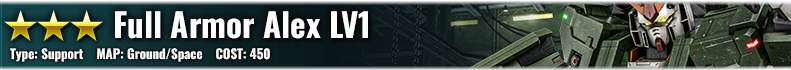 【Alex】 Spec ・Close Part Slot is increased as “14” → “15”(Upper LVs are also enhanced) ・Mid-range Part Slot is increased as “12” → “13”(Upper LVs are also enhanced) ・Long Part Slot is increased as “6” → “8”(Upper LVs are also enhanced) ・LV4 Unit skill “AD-FCS LV1” is increased to “LV2” ・LV4 Unit skill “AD-PA LV1” is increased to “LV2” ・LV4 Unit skill “Enhanced Shield Structure LV1” is increased to “LV2” ・LV4 Unit skill “Complex Expansion Slot LV1” is increased to “LV2” Melee Main Weapon: 【Alex Beam Saber】 ・Combo attack compensation increased ・LV2 Power is increased as “2345” → “2400”(Upper LVs are also enhanced) Sub-Weapon: 【Arm 90mm Gatling Cannon】 ・Power is increased as “125” → “130”(Upper LVs are also enhanced) ・Rate of fire has been increased. ・Stagger Accumulation Value is increased