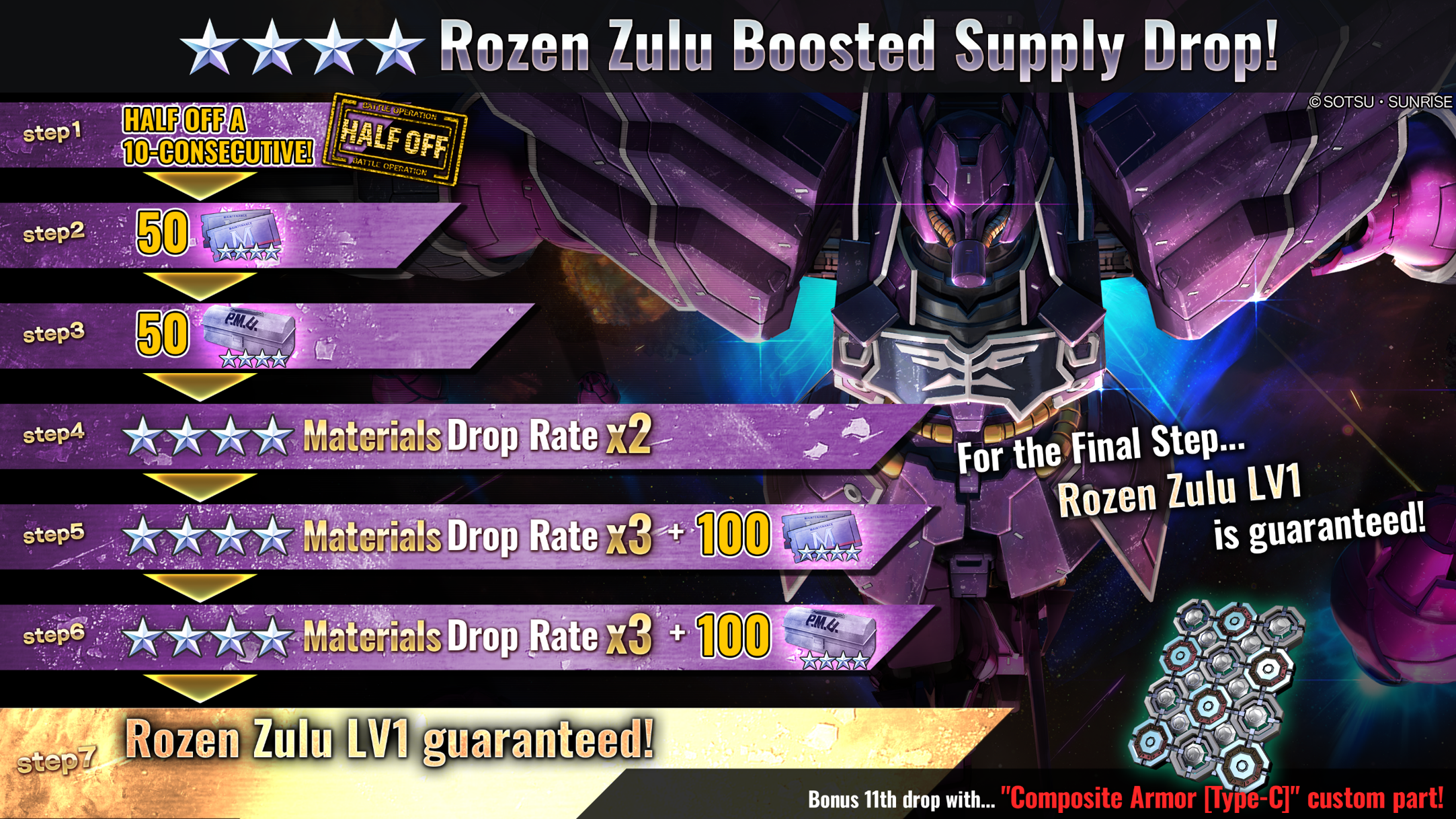 ■Guaranteed Rozen Zulu Boosted Supply Drop Notice Starting from [PST]01/25/2024 / [CET]01/25/2024, Guaranteed obtainable Rozen Zulu LV1 STEP UP Supply Drop will begin. ■Period [PST] 01/25/2024 00:00 – 01/31/2024 20:30 [Scheduled] [CET] 01/25/2024 09:00 – 02/01/2024 05:30 [Scheduled] ■Contents A Supply Drop, in which 10 consecutive Supply Drops can be requested up to STEP7. The STEP will progress by 1 each time you perform a request, as STEP1 → STEP2 → STEP3 → STEP4 → STEP5 → STEP6 → STEP7. After STEP4 is requested, Boosted Supply Drop will be over. ・STEP1 (15 Tokens): Token 50% OFF! ・STEP2 (30 Tokens): As a bonus 50 Mechanic Tickets [★★★★] are obtainable! ・STEP3 (30 Tokens): As a bonus 50 Modification Kit [★★★★] are obtainable! ・STEP4 (30 Tokens): 2x Chance of obtaining "★★★★" materials! ・STEP5 (30 Tokens): 3x Chance of obtaining "★★★★" materials! + As a bonus 100 Mechanic Tickets [★★★★] are obtainable! ・STEP6 (30 Tokens): 3x Chance of obtaining "★★★★" materials! + As a bonus 100 Modification Kit [★★★★] are obtaianble! ・STEP7 (30 Tokens): 1 Guaranteed Obtainable "Rozen Zulu LV1" !! + As a bonus Custom Part "Composite Armor[Type-C] LV1" is obtainable! ■Custom parts ◎Composite Armor[Type-C] LV1 ・Repair tool's HP recovery rate increases 10%. ・Ballistic/Melee Resistance goes up 4. ⇒ If Enhancement List level reaches 3, Ballistic/Melee Resistance increases 3 more. After reaching level 6, Ballistic/Melee Resistance increases 3 more. ※Same supplies will be drawn as the ongoing Supply Drops. For Details, please check [Item List].