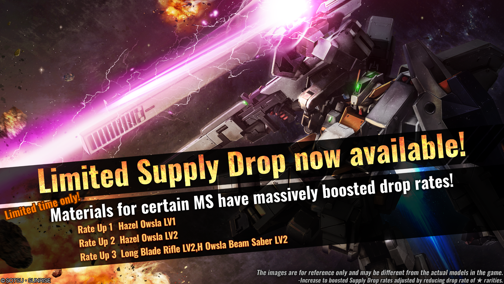 ■Notice of “Limited Supply Drop!! Hazel Owsla” Starting from [PST] 01/11/2024 / [CET] 01/11/2024, a Limited Supply Drop with Boosted Drop Rate for a part of MS related drops will begin. ■Period [PST] 01/11/2024 00:00 – 01/17/2024 20:30 [Scheduled] [CET] 01/11/2024 09:00 – 01/18/2024 05:30 [Scheduled] ■Contents During this time, "Limited Supply Drop (Once / 10 Times)" can be requested from the material counter. Within the Limited Supply Drop, Hazel Owsla's drop rate will be increased. ■Featured Material with a Big Boost to its Supply Drop Rate In the Limited Supply Drop, each LV of the specified unit and its related main weapons will be affected. ◎Supply Drop Rate Increase① (Item Amount 1) ・★★★ Hazel Owsla LV1 (General unit, ground/space use, cost: 550) ◎Supply Drop Rate Increase② (Item Amount 1) ・★★★ Hazel Owsla LV2 (General unit, ground/space use, cost: 600) ◎Supply Drop Rate Increase③ (Item Amount 2) ・★★ Long Blade Rifle LV2 ・★ H Owsla Beam Saber LV2 ■Supply Drops that are affected by the drop rate increase ・Limited Supply Drop ※Material Lineup that can be received from the Limited Supply Drop will be the same as the current Supply Drop lineup. Only the specified items in the Limited Supply Drop will be boosted, differing from the Standard Supply Drop. ※Drop Rate increase of the Limited Supply Drop will affect the Unit of each LV and has a different effect on the unit's main weapon. e.g. When Unit LV1–2 and Main Weapon are affected by the drop rate increase. ・Unit LV1’s Drop Rate increased by “3%” ・Unit LV2’s Drop Rate increased by “3%” ・Main Weapon's Drop Rate Increase "3%" The increase in the Supply Drop Drop Rate will be adjusted by reducing the Supply Drop Rate of "★" rarity. ※Regarding the detailed Lineup of the Limited Supply Drop, please check [Item List]. ※The amount of tokens required to request a Limited Supply Drop is the same as Normal Supply Drops. (Once - 3 Tokens / 10 Times - 30 Tokens) ※Keep in mind of last day of this Limited Supply Drop period.