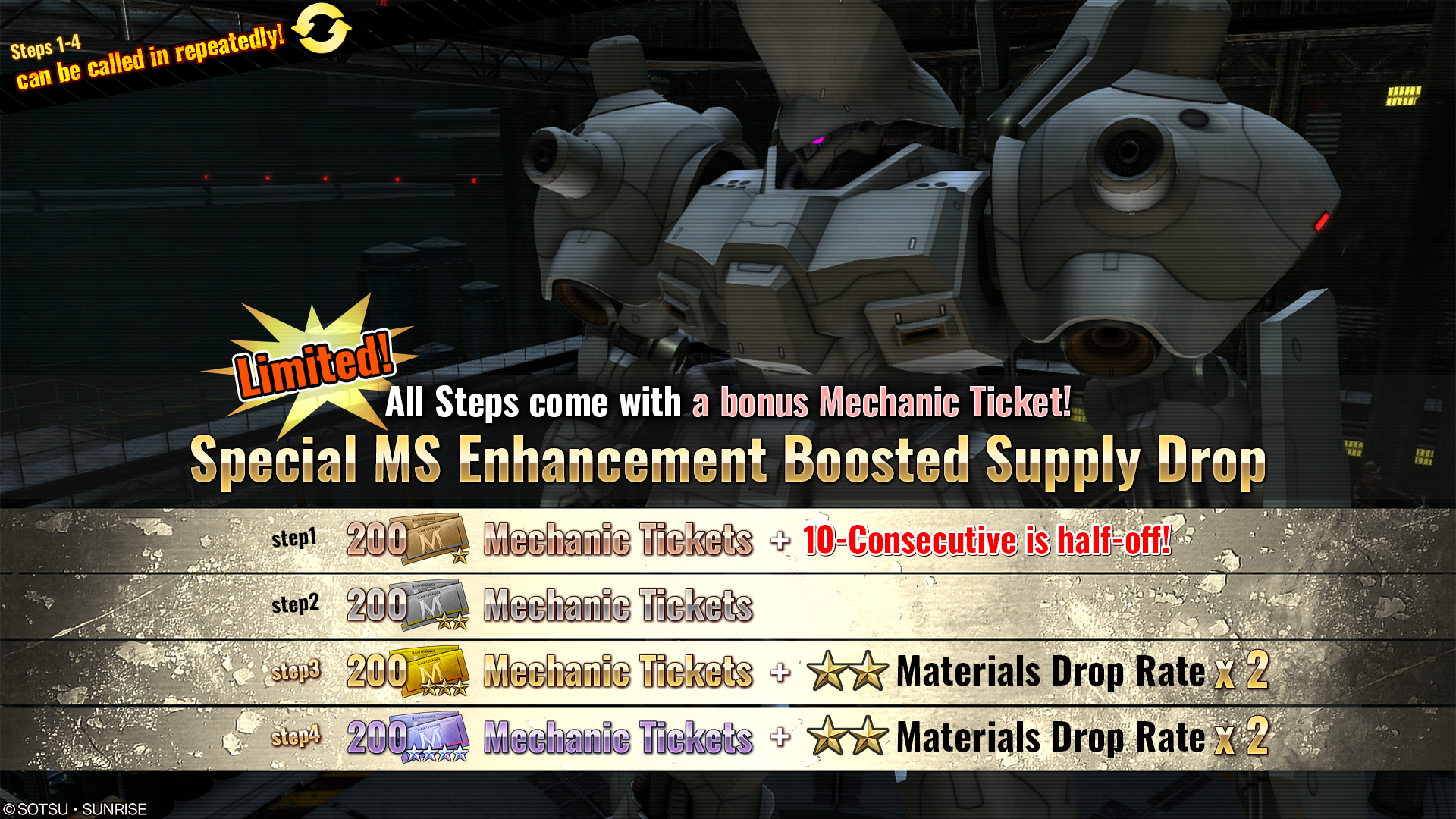 ■Events 1."Time-limited! Special MS Enhancement STEP UP Supply Drop" Beginning on [PST] 11/16/2023 / [CET] 11/16/2023, "Time-limited! Special MS Enhancement STEP UP Supply Drop" will begin. ■Period [PST] 11/16/2023 01:00 – 11/29/2023 20:30 [Scheduled] [CET] 11/16/2023 10:00 – 11/30/2023 05:30 [Scheduled] ■Content A Supply Drop, in which 10 consecutive Supply Drops can be requested up to STEP4. The STEP will progress by 1 each time you perform a request, as STEP1 → STEP2 → STEP3 → STEP4. You can restart ALL STEPs from STEP1 after you finished the STEP4. ・STEP1 (15 Tokens):10 consecutive Supply Drops 50% OFF & 200 Mechanic Tickets [★] for bonus! ・STEP2 (30 Tokens):200 Mechanic Tickets [★★] for bonus! ・STEP3 (30 Tokens):200% drop rate for ★★ or above from Supply Drop & bonus of 200 Mechanic Tickets [★★★] for bonus! ・STEP4 (30 Tokens):200% drop rate for ★★ or above from Supply Drop & bonus of 200 Mechanic Tickets [★★★★] for bonus! ※Same supplies will be drawn as the ongoing Supply Drops. For details, please check the [Item List]. ※This STEP UP lineup will be updated on [PST] 11/23/2023 00:00 / [CET] 11/23/2023 09:00. Due to this update, information will not be available in Supply Counter from [PST] 11/22/2023 20:30 / [CET] 11/23/2023 05:30 until the maintenance is finished. Please note that STEP process will NOT be reset after the lineup update.