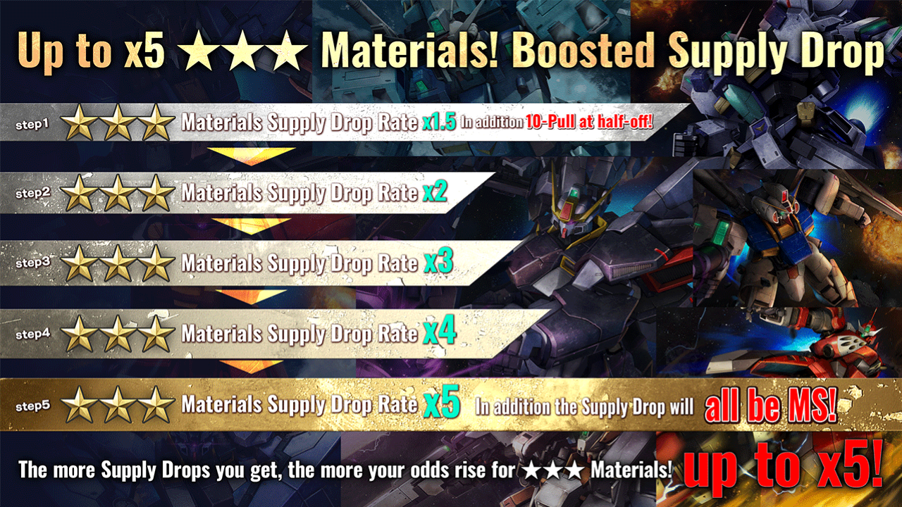 ■【Autumn Festival】 Part 3 - Boosted Supply Drop! Starting from [PDT] 10/12/2023 / [CEST] 10/12/2023, "Unaquired MS Boosted Supply Drop" will begin. ■Period [PDT] 10/12/2023 01:00 – 10/18/2023 21:30 [Scheduled] [CEST] 10/12/2023 10:00 – 10/19/2023 06:30[scheduled] ■Content A Supply Drop, in which 10 consecutive Supply Drops can be requested up to STEP 4. The STEP will progress by 1 each time you perform a request, as STEP 1 → STEP 2 → STEP 3 → STEP 4. After STEP 4 is requested, Boosted Supply Drop will be over. ・STEP1 (30 Tokens): 2 Guaranteed ★★ rarity MS! ・STEP2 (30 Tokens): 1 Guaranteed unobtained ★★ or above rarity MS! ・STEP3 (30 Tokens): 2 Guaranteed unobtained ★★ or above rarity MS! ・STEP4 (30 Tokens): 2 Guaranteed unobtained ★★★ or above rarity! and all materials are MS! ※Please also see the following notes regarding "Unobtained MS".