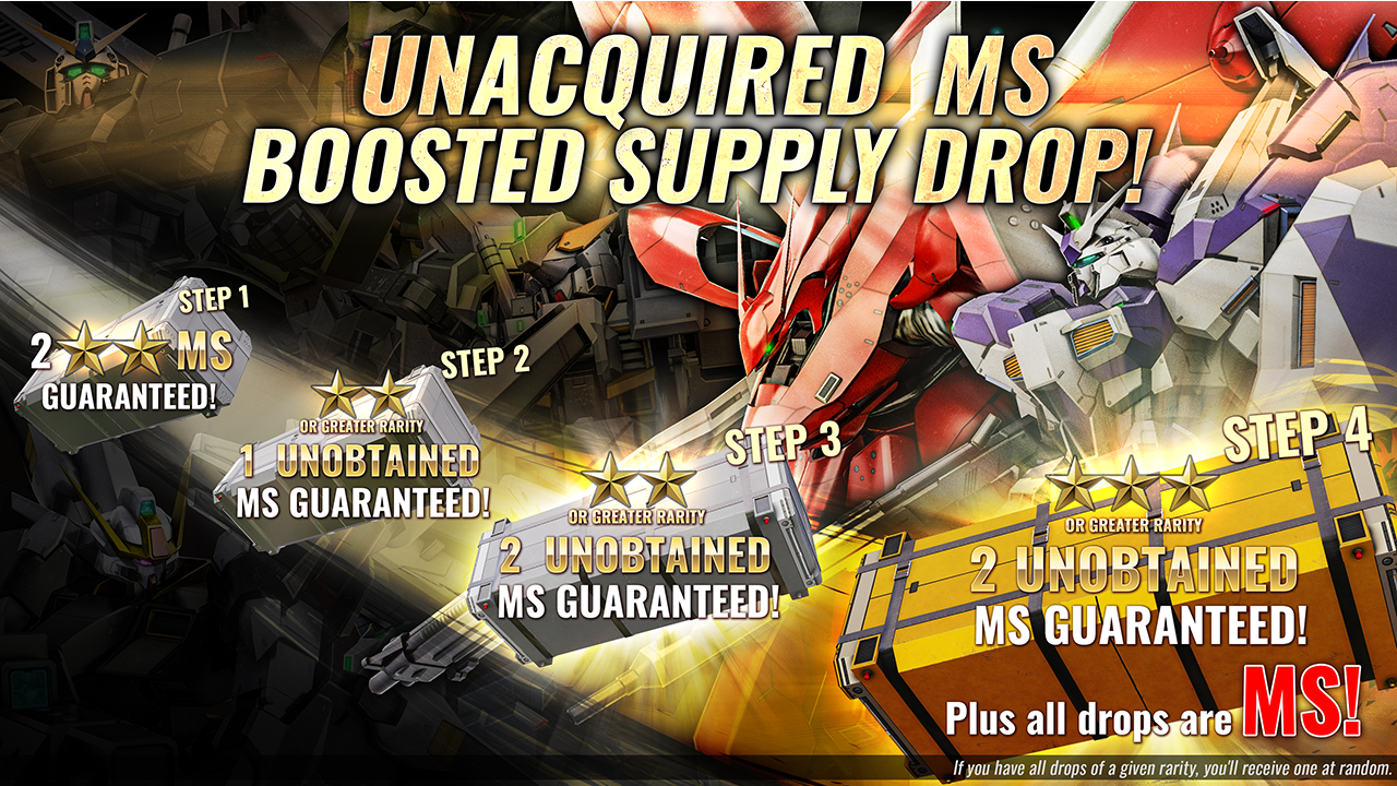 ※By STEP2 – STEP4, MS with the specified rarity that are not obtained at the time of Supply Drop will be available. If all MS of that rarity are obtained, pilots will get 1 MS randomly. ※Please note that if you leave an MS that you have never obtained at the reward window without receiving it, it will not be treated as "obtained" and will be drawn as, MS of the specified rarity that you have not obtained" by STEP2 – STEP4. ※The same supplies will be drawn as the ongoing Supply Drops. For details, please check [Item List].