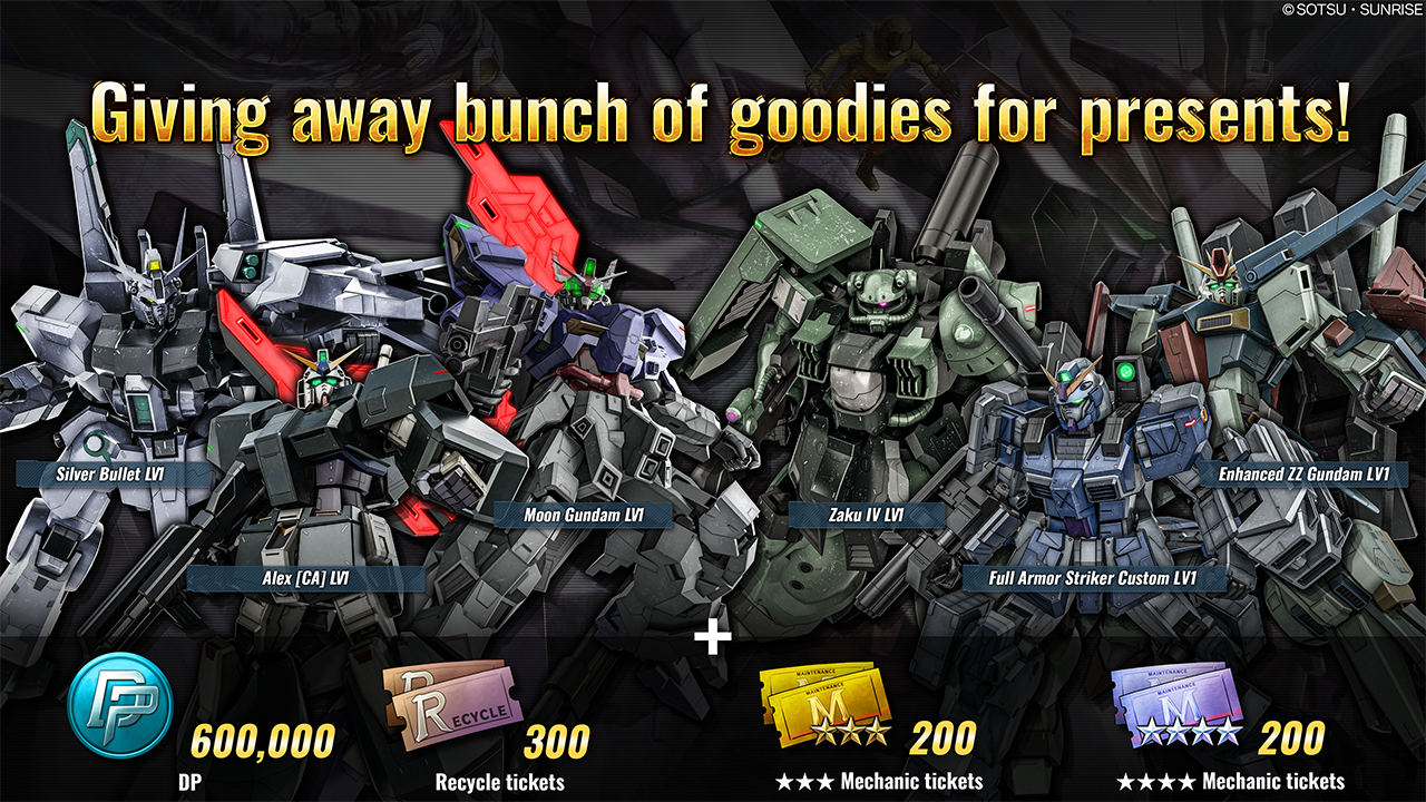 ■April 2025 Premium Login Bonus ◎[PDT] 03/31/2025 13:00 – 04/10/2025 12:59 ◎[CET] 03/31/2025 21:00 – 04/10/2025 20:59 ・List of items you can get MS: ★★★★ RX-93ff Nu Gundam LV1 Other: Mechanic ticket [★★★★]–[★★★★★], Modification kit [★★★]–[★★★★], Hanger usage permission , DP, Token