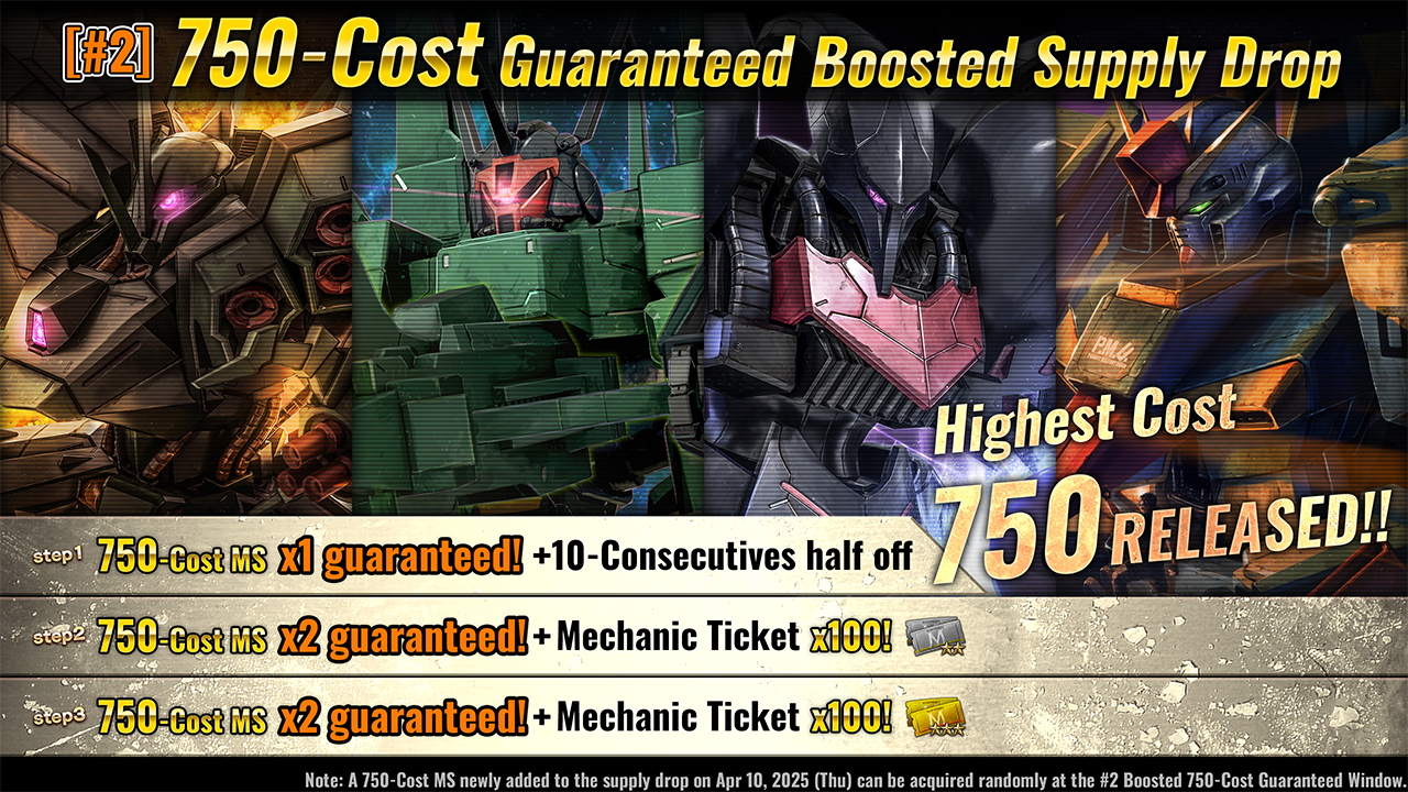 ■Content A Supply Drop, in which 10 consecutive Supply Drops can be requested up to STEP3. The STEP will progress by 1 each time you perform a request, as STEP1 → STEP2 → STEP3. After STEP3 is requested, Boosted Supply Drop will be over. ・STEP1 (15 tokens): 1 COST 750 MS guaranteed! + 50% token off! ・STEP2 (30 tokens): 2 COST 750 MS guaranteed! + 100 ★★ Mechanic tickets as a bonus! ・STEP3 (30 tokens): 2 COST 750 MS guaranteed! + 100 ★★★ Mechanic tickets as a bonus!