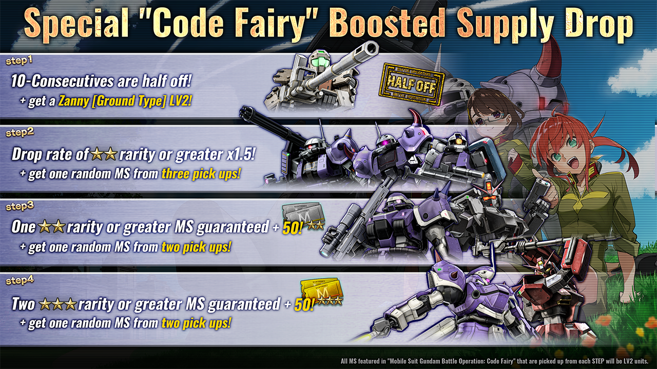 1. Special Code Fairy STEP UP Supply Drop Starting from [PDT] 03/18/2025 / [CET] 03/18/2025, "Special Code Fairy STEP UP Supply Drop" will begin. ■Period [PDT] 03/18/2025 01:00 – 03/26/2025 21:30 [Scheduled] [CET] 03/18/2025 09:00 – 03/27/2025 05:30 [Scheduled] ■Content A Supply Drop, in which 10 consecutive Supply Drops can be requested up to STEP4. The STEP will progress by 1 each time you perform a request, as STEP1 → STEP2 → STEP3 → STEP4. Once STEP4 finished and this STEP UP Supply Drop will be over. ・STEP1 (15 Tokens): Tokens 50% OFF! + 1 ”Zanny [Ground Type] LV2” guaranteed! ・STEP2 (30 Tokens): ★★ or above materials drop rate will be x1.5! + 1 random picked up MS guaranteed! ・STEP3 (30 Tokens): 1 ★★ or above MS guaranteed! + another 1 random picked up MS guaranteed! + also, 50 ★★ Mechanic Tickets for present! ・STEP4 (30 Tokens): 2 ★★★ or above MS guaranteed! + another 1 random picked up MS guaranteed! + also, 50 ★★★ Mechanic Tickets for present! ■STEP2 - Picked up MS ・★★ Zaku Half-Cannon (MB) LV2 (General unit, ground only, cost: 350) ・★★ High Mobility Zaku Ground Type (AS) LV2 (Raid unit, ground only, cost: 400) ・★★ Zaku II [Sniper Type] (HH) LV2 (Support unit, ground only, cost: 350) ■STEP3 - Picked up MS ・★★ GM Spartan (RG) LV2 (General unit, ground only, cost: 500) ・★★ Efreet Jaeger LV2 (General unit, ground only, cost: 500) ■STEP4 - Picked up MS ・★★★ Gundam Pixy (LA) LV2 (Raid unit, ground only, cost: 550) ・★★★ Titania LV2 (Raid unit, ground/space uses, cost: 550) ※Same supplies will be drawn as the ongoing Supply Drops. For details, please check the [Item List]. ※Please make sure to have a check to the event schedule so that you won't miss the event.