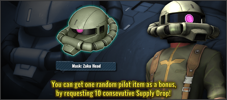 ■Bonus Item Content ■Accessory Mask: Zaku Head ※Requesting 10-Consecutive Supply Drops during the campaign will grant you an additional 11th supply drop, and get 1 extra item. ※Single Supply Drop is NOT applied with this benefit. The bonus item will not be awarded even if you request the 1-Attempt Supply Drop ten times in a row.