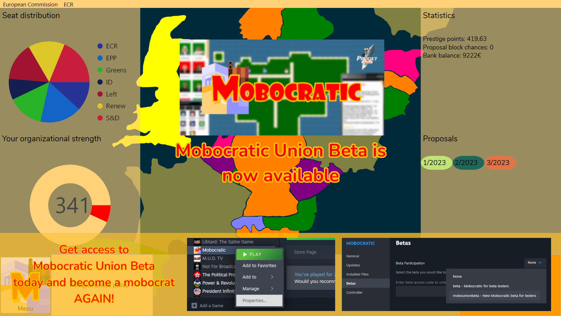 We're excited to announce the beta of Mobocratic sequel, Mobocratic Union to all current Mobocratic owners. Mobocratic Union simulates the decision-making in a supranational union resembling the European Union in it's most crucial levels. The game simulates over 700 dynamically created politicians, committee meetings, parliament plenaries, council meetings and even more is to come. This is a new solid ground for the Mobocratic!
