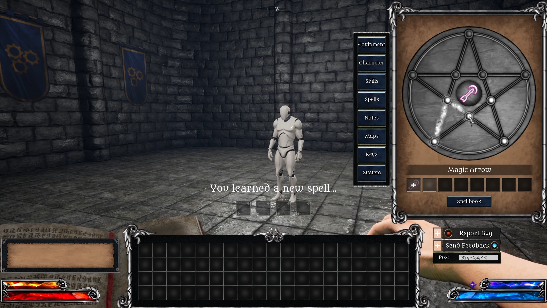 In order to cast a spell you first need to memorize it. The number of memorized spells depends on your character stats. In order to memorize a spell you have to activate a spell pattern on a pentagram. To do so, you collect “Echo Stones”, magic artifacts of divine origin, each representing a god in the world of Ariath. The stones are fixed on the pentagram. If you wish to memorize a spell, you have to activate the correct order of Echo Stones. If your character is intelligent enough the resulting spell can be memorized in one of your spell slots.