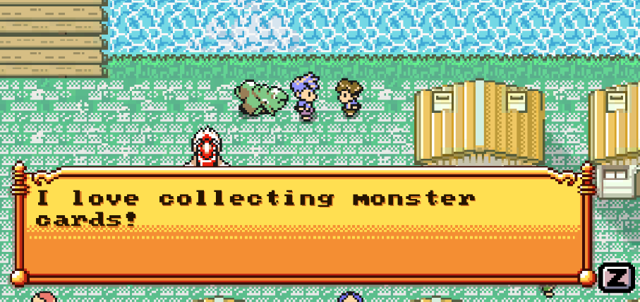 Visit this kid to get your very own Monster Trading Card Binder. You'll be able to buy booster packs at any store, but your first hit is free as this guy spares you a booster. Once you've opened your pack you'll receive a random assortment of cards for your collection. You can examine your collection from this button on the main menu: