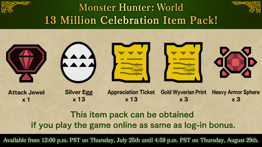 14 million copies of Monster Hunter: World have been shipped worldwide (including digital sales), a new record for the series! To celebrate, all players will receive a free item pack for a limited time only!