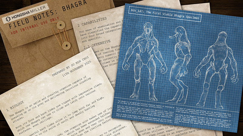 The claws on the Bhagra’s forelimbs are long and sharp, capable of tearing flesh into ribbons in only a few strikes. In a purely numeric comparison against the other two viable specimens currently housed at Sparrowlock, the damage of Bhagra’s claws is comparable with the Malacosm, but weaker than the raw strength of the Brute’s punch. Where the Bhagra comes into its own is when it ambushes and pounces upon its prey. This bodily attack allows it to bite down on its victim with its long maw, tearing a human apart in seconds.