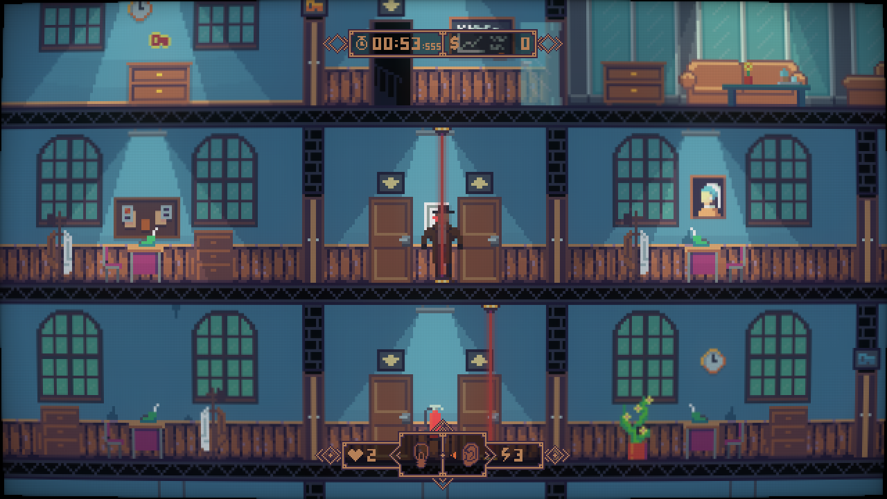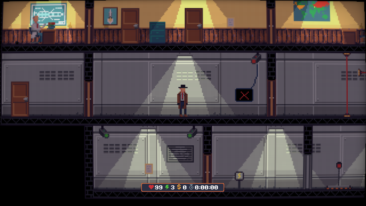 The Goal or Mission Objective is derived from the story background. We currently support the following variants: information gathering missions (safe-cracking and photo missions), sabotage, kidnapping and theft missions. Challenges are the obstacles the player has to overcome in order to fulfil the mission goal. To make the obstacles a bit harder and add some pressure on the player there are some losing constraints in the form of player detections - e.g. Security cameras or guards. Every level shall rely on two main puzzle mechanics only. This gives the player a better feeling on how to handle situations, does not overload the level and make the levels overall more diverse. Level designs shall be designed “form follow function” approach in contrast to what we had in the game jam. Design the puzzles first and afterwards design the rooms.