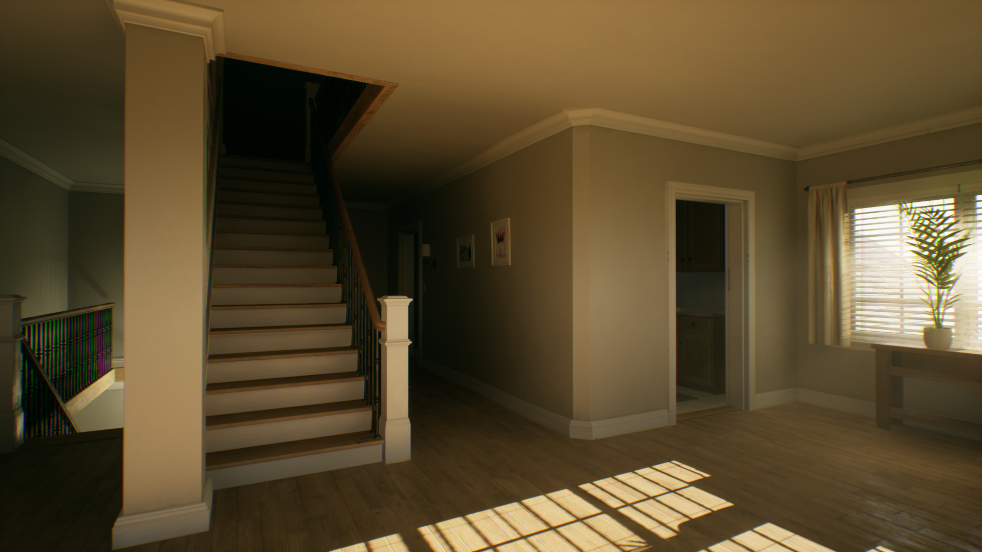 (Unmodified house) A screenshot from the front door looking at the living room.