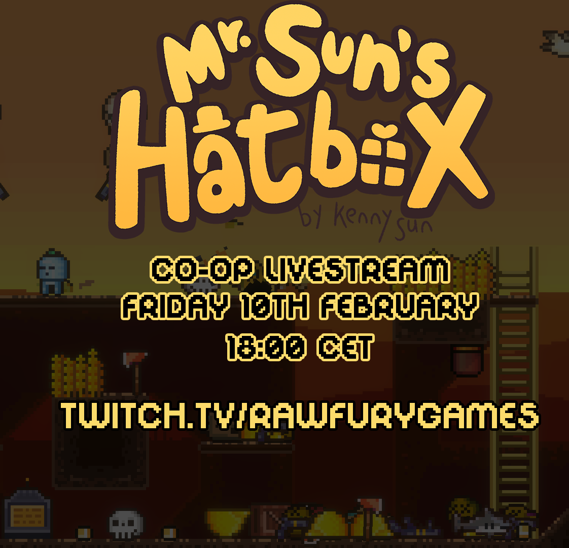 Watch the Raw Fury team play Mr Sun's Hatbox's new Co-op mode on Twitch on Friday 10th of February at 18:00 CET!