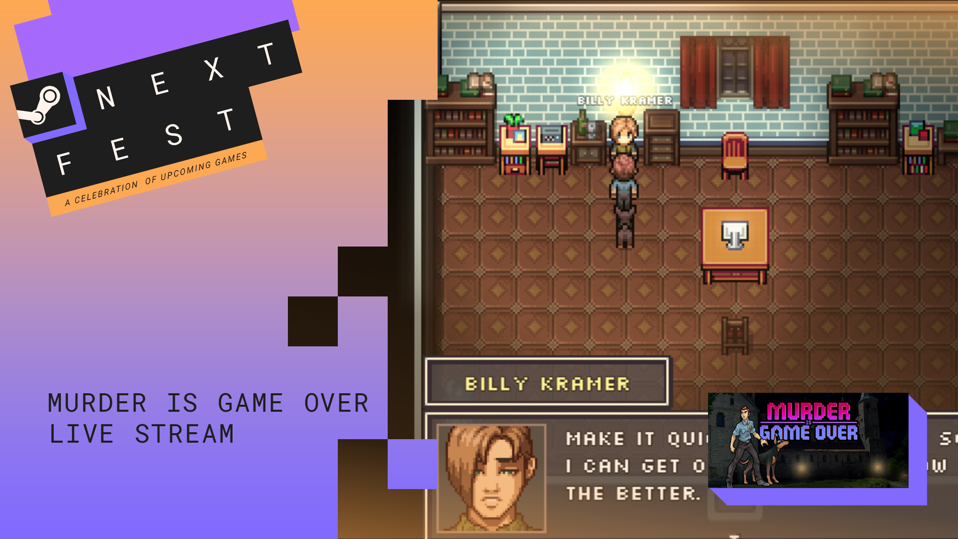 Murder Is Game Over is a pixel art point-and-click murder mystery whodunit involving the death of a famous game designer. You and your trusty companion, Cleo, are on the case.