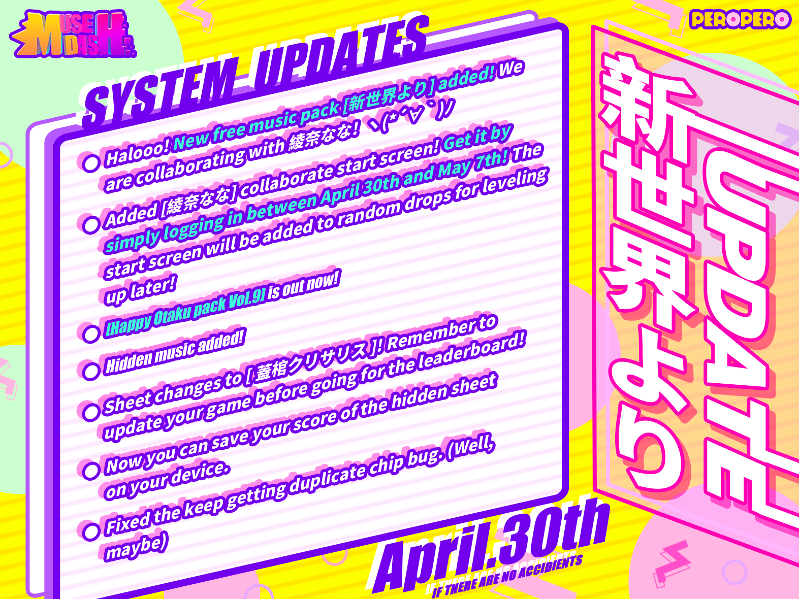 Eat, sleep, drink coke! [Happy Otaku pack Vol.9] is on time and arrived! And another good news, We are collaborating with Ayana Nana! ヽ(*´∀`)ノ New song [新世界より] and new start screen will both be free to everyone! Let's take a look at what else we got for you this month!