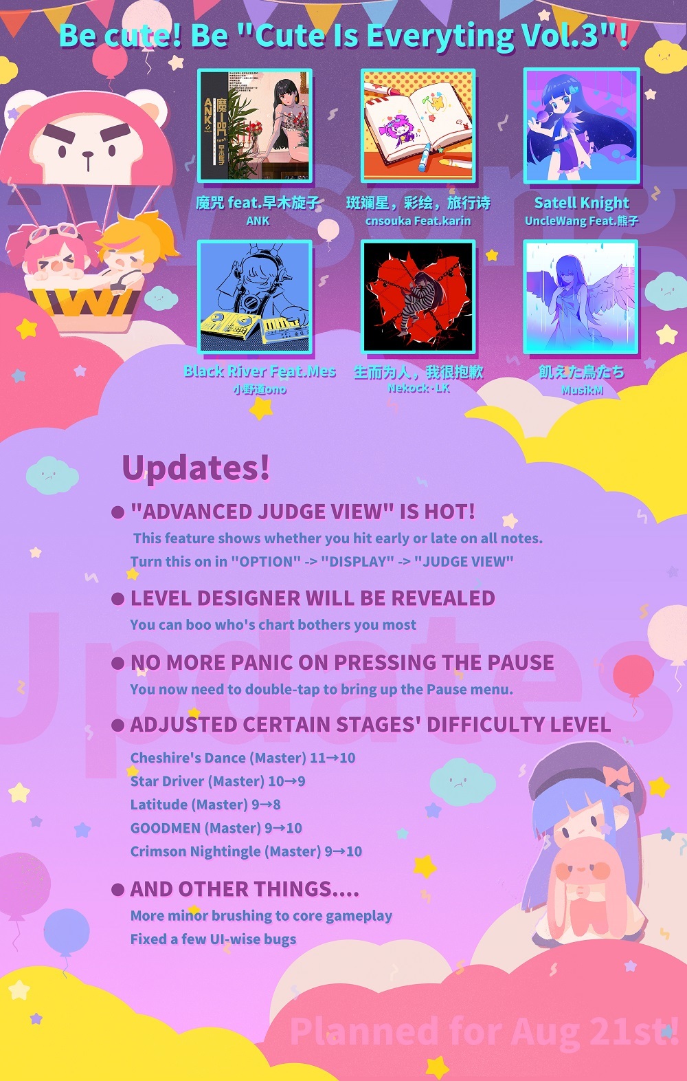 Since Sugar & Co.(ANK feat. kumako) just released their new album [Bon Bon Appetit!!], we secured two of their new song [雨后甜点] and [FUTUREPOP]! Combined with 4 new songs, a new illustration, and limited-time free to play event for all of the five songs from Sugar & Co.(ANK feat. kumako)! Enjoy your lethal dose of sugar! Muahahahaha!