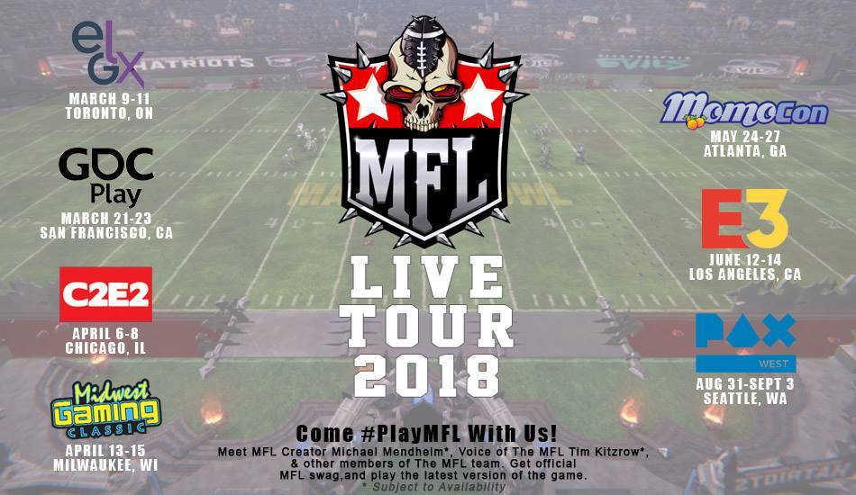 Come Play MFL with us! There are just two stops left on the MFL Live Tour 2018. Next up in a couple weeks is the granddaddy of all gaming shows - E3! Meet MFL Creator Michael Mendheim*, Mouth of The MFL Tim Kitzrow*, & other members of The MFL team. Get official swag & play the latest version.