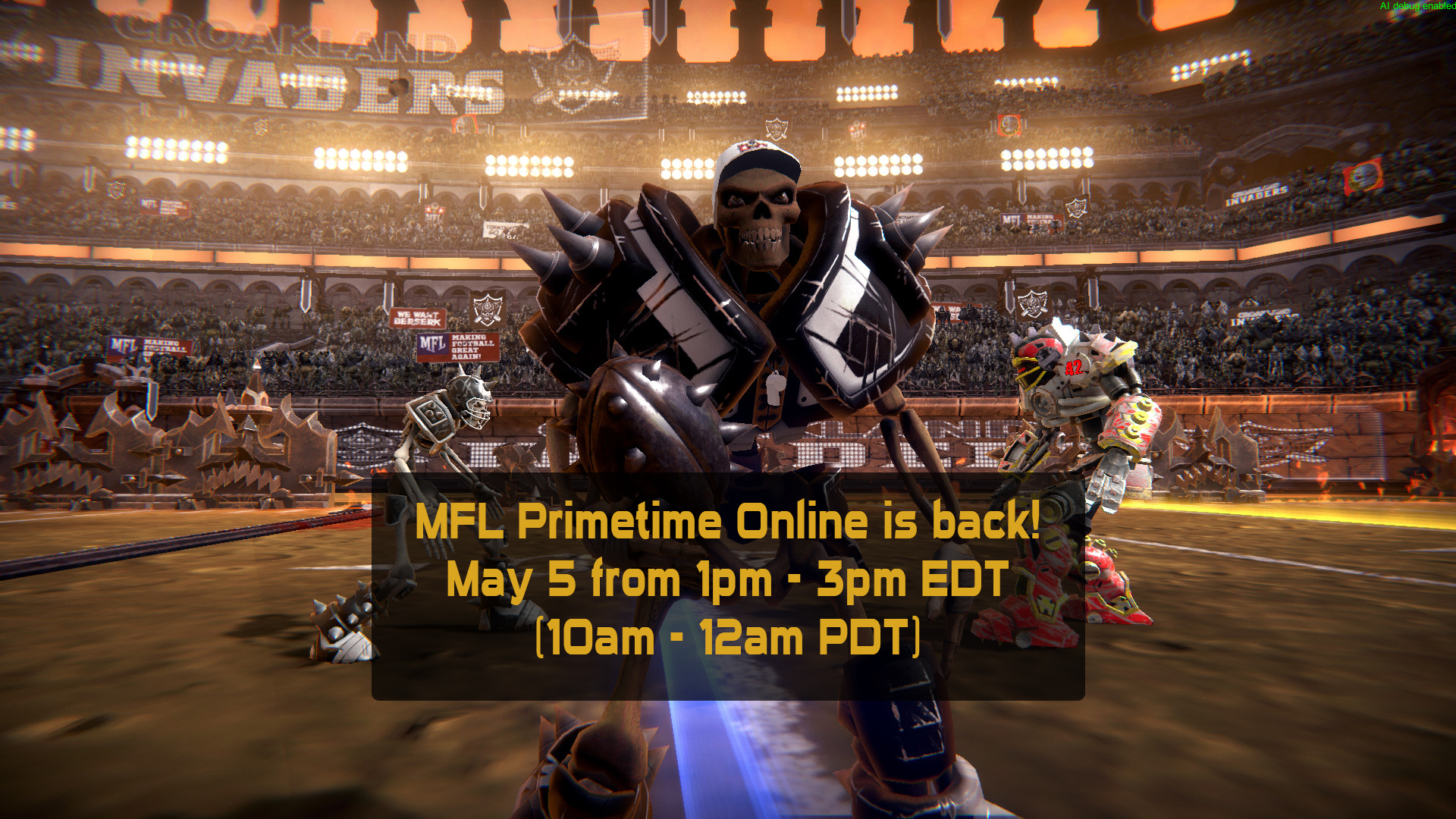 Join us and your fellow players this Saturday, May 5 from 1pm - 3pm EDT (10am - 12am PDT) for The MFL Primetime Online "Random Match" Event. Play MFL on your choice of PlayStation 4, Xbox One, or Steam!