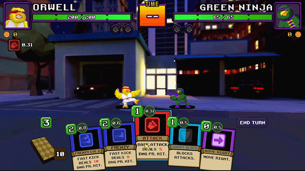 MKC is a turn-based, deck-builder with real time execution. Select your fighter, explore the city, collect cards, fuse cards to create combos and fight you way through South City's