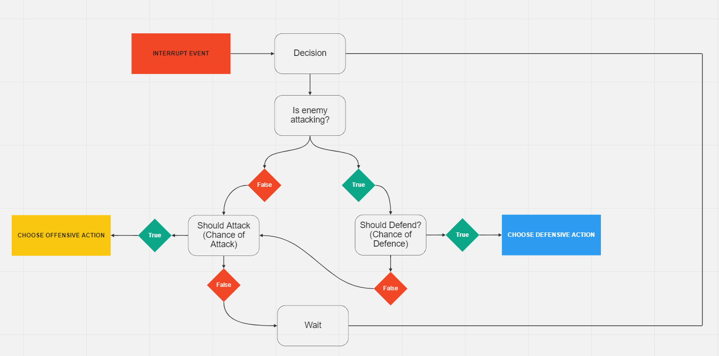 After introducing the new normal attack types in the last update the AI felt too weak. I had a look at Attack and Defend patterns and found that the AI was structured wrong so decisions were made too slow and with the wrong info. I restructured the decision making to something like this. Each fighter now has a reaction time, decision time, change defense and change of attack. This makes them feel way more responsive. When choosing an attack action the AI then selects patterns based on distance then health (does the AI have attacks used only when low or high health). Then the list of available actions are sorted by priority and an action is selected. Defensive actions are selected based on type of attack and sometimes distance. I also want to simplify the patterns and have fewer of them. A pattern is a sequence of button, d-pad inputs the AI gets and how long the button press is. Before they would have pretty long sequences.
