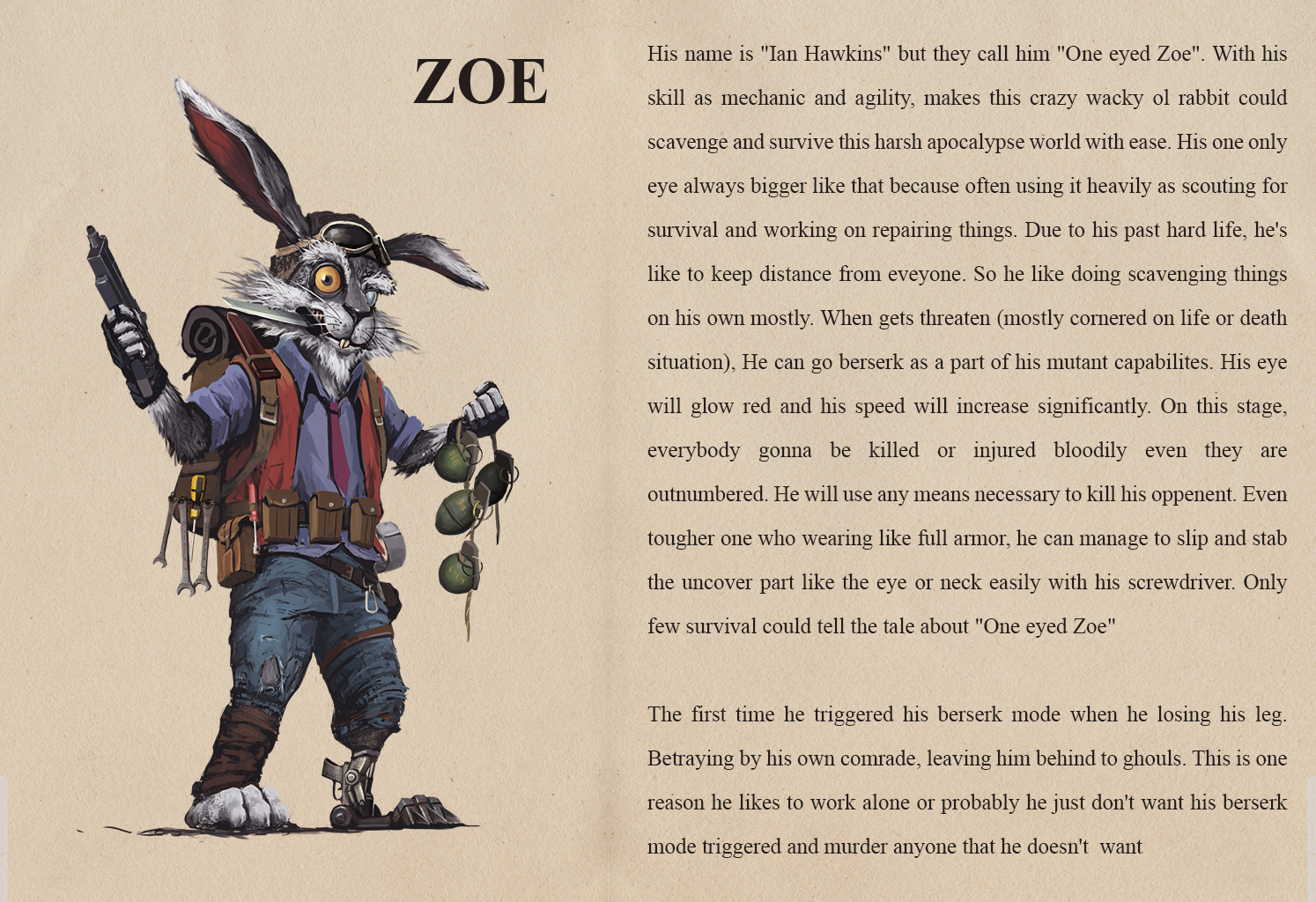 During his travel through the wastes, Preem found a peculiar device - the Sony Walkman. A machine that spoke to him and weaved stories from nothingness. He kept it secret, listening it every night for comfort and scouring through junk on the regular for the metallic AA tubes that refilled its whispers.