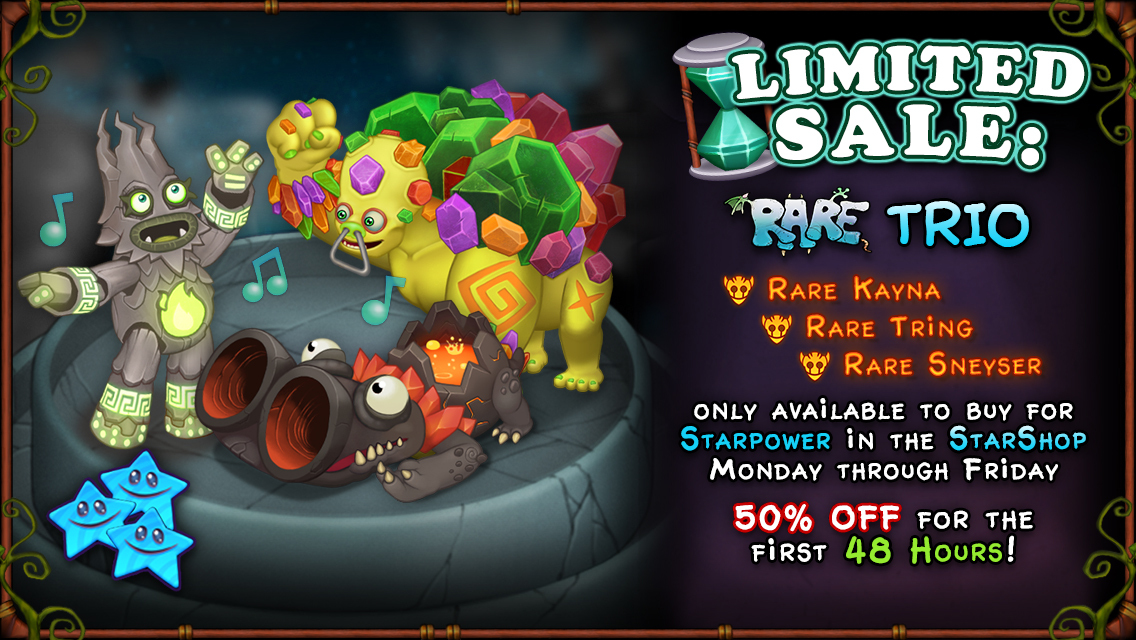 During a Rare Trio, three Rare Monsters are available to buy in the StarShop Monday through Friday, and will be 50% OFF for the first 48 hours. This week - Rare forms of Kayna, Tring and Sneyser are available across their respective Islands! NOTE: the Monsters cannot be bred.
