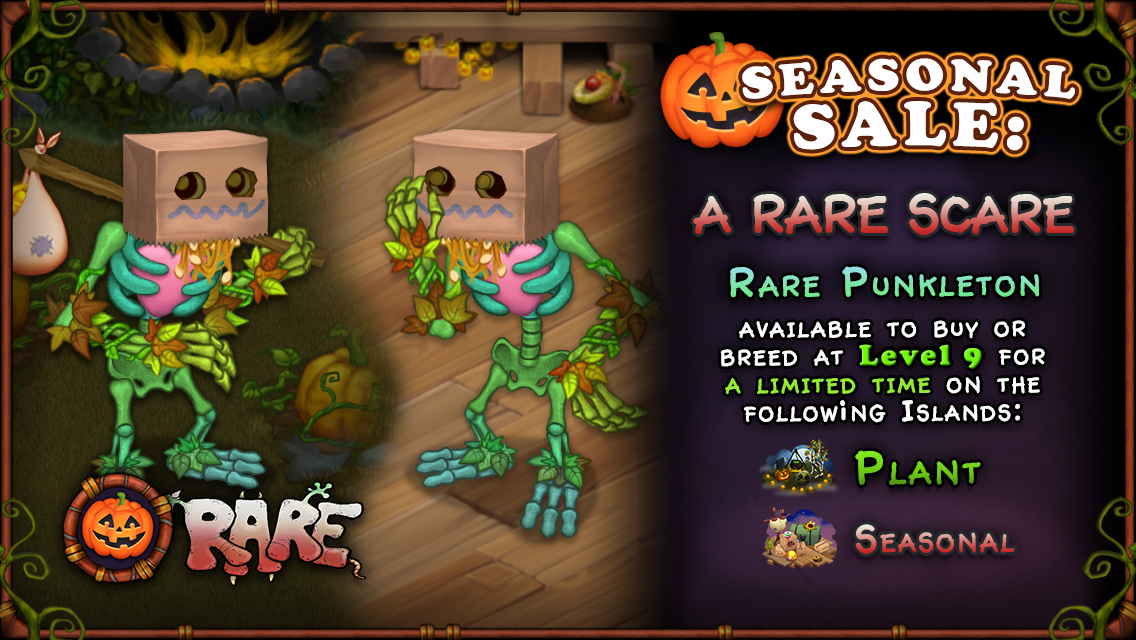Epic Punkleton has finally arrived to ring in Spooktacle on Plant Island and Seasonal Shanty... and Rare Punkleton is back for an encore! Buy or breed these Special Seasonal Monsters and complete your collections!