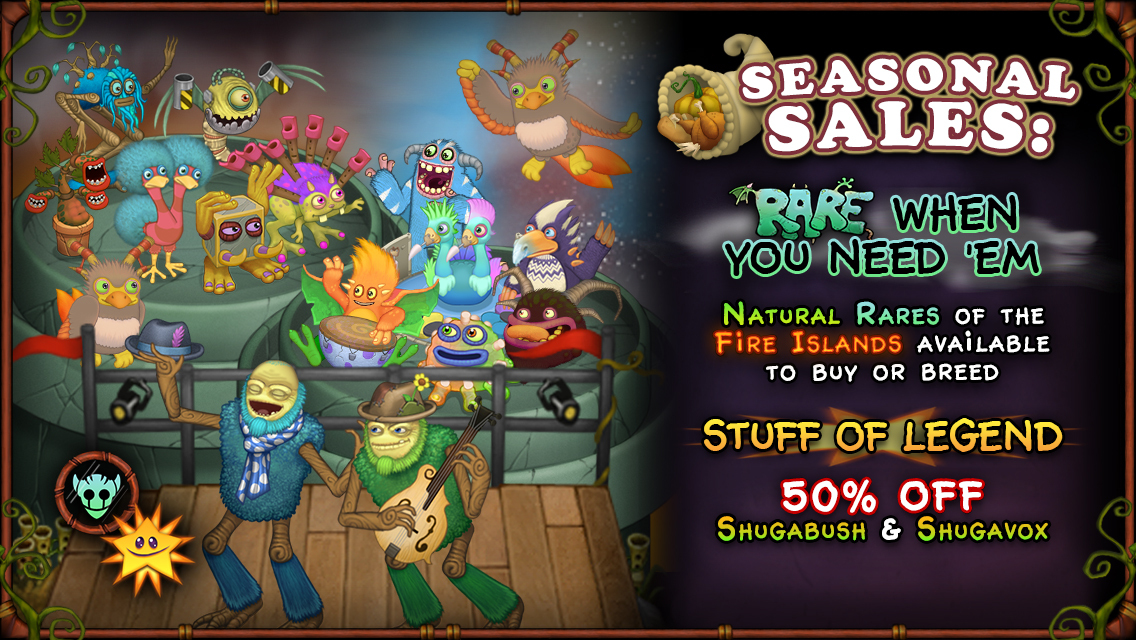 The musical skill of the Shugabush and its Shugafam kindred is truly the stuff of legend. This weekend, the original Legendary Monster and its vocalist cousin, the Shugavox, are 50% OFF in the Market on Plant and Shugabush Islands.