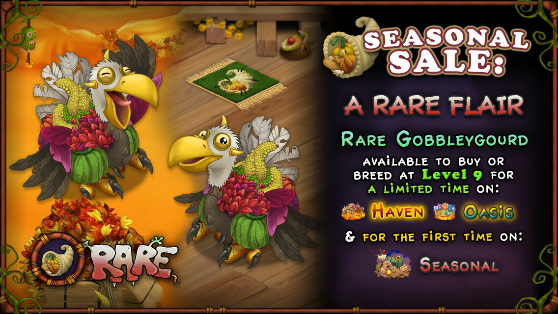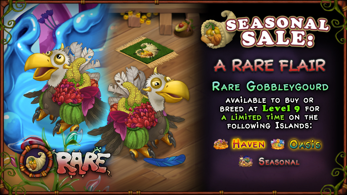 The festive Rare Gobbleygourd is back for a limited time to buy or breed on Fire Haven, Fire Oasis, and available for the first time on Seasonal Shanty! You never know when it's going to appear next, so add it to your collections while you can!