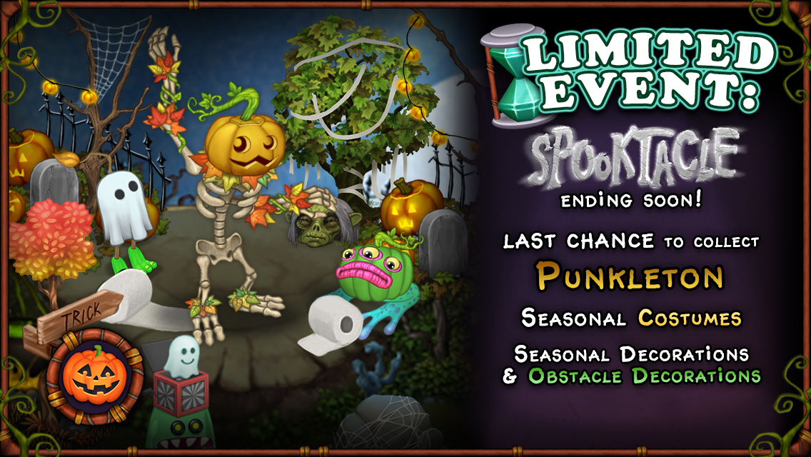 The Spooktacle Seasonal Event is drawing to a close. This weekend is your last chance to add Punkleton to your collection before it retreats back underground. While Plant Island and its Obstacles will soon resume their Natural appearances, it's also your last chance to buy Spooktacle-themed Decorations, Rocks and Trees, which you can keep all year round!