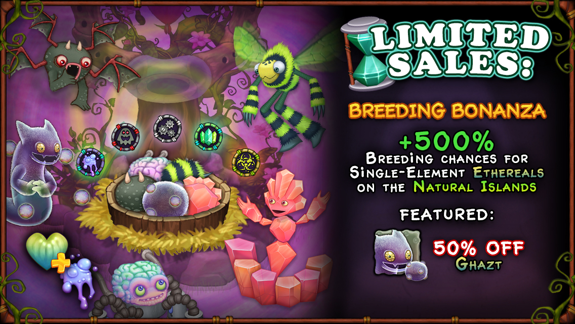 Giddy up... it's BONANZA Time! For a limited time, enjoy +500% breeding chances for Single-Element Ethereals - Ghazt, Grumpyre, Reebro, Jeeode and Humbug - on their respective Natural Islands!
