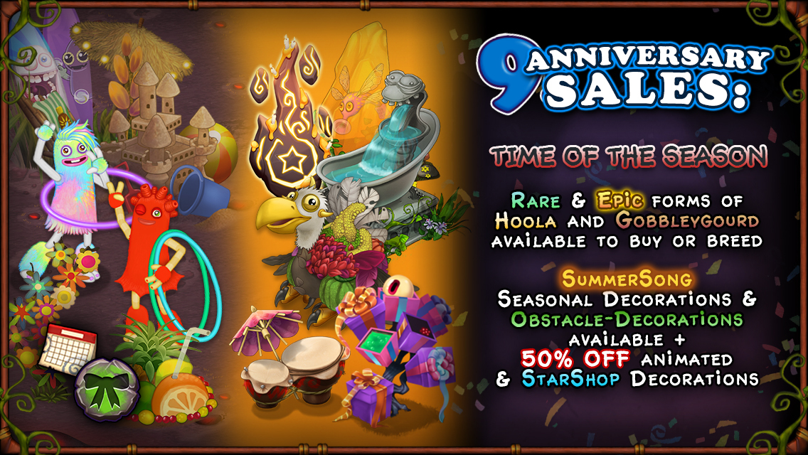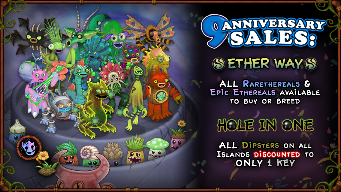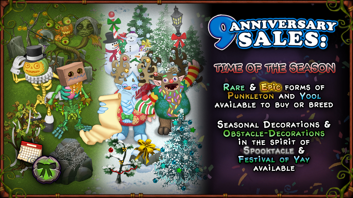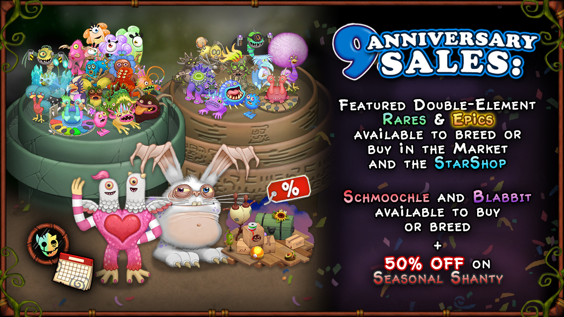 September is Anniversary Month, celebrating 9 years of My Singing Monsters with new content and sales all month long! Make sure to log in regularly throughout the month so you don't miss out on any promotions or special offers!