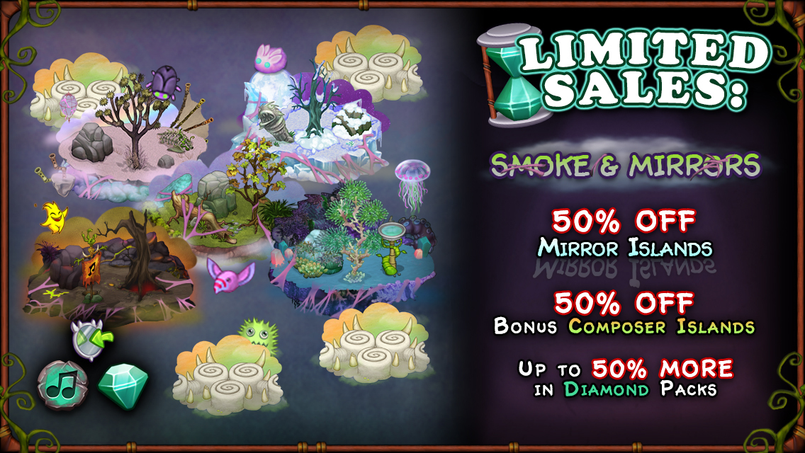 The mysterious Mirror Islands, alternate versions of the Natural Islands that have been lost in time and space, are available for 50% OFF! These 'blank canvases,' strewn with artifacts and debris from their interdimensional tumblings, will come in handy during Anniversary Month to house even more limited-time Monsters available throughout September!