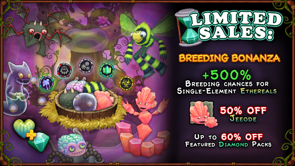 [expand type="details"]Giddy up... it's BONANZA Time! This weekend, enjoy +500% breeding chances for Single-Element Ethereals - Ghazt, Grumpyre, Reebro, Jeeode and Humbug - on their respective Natural Islands![/expand]
