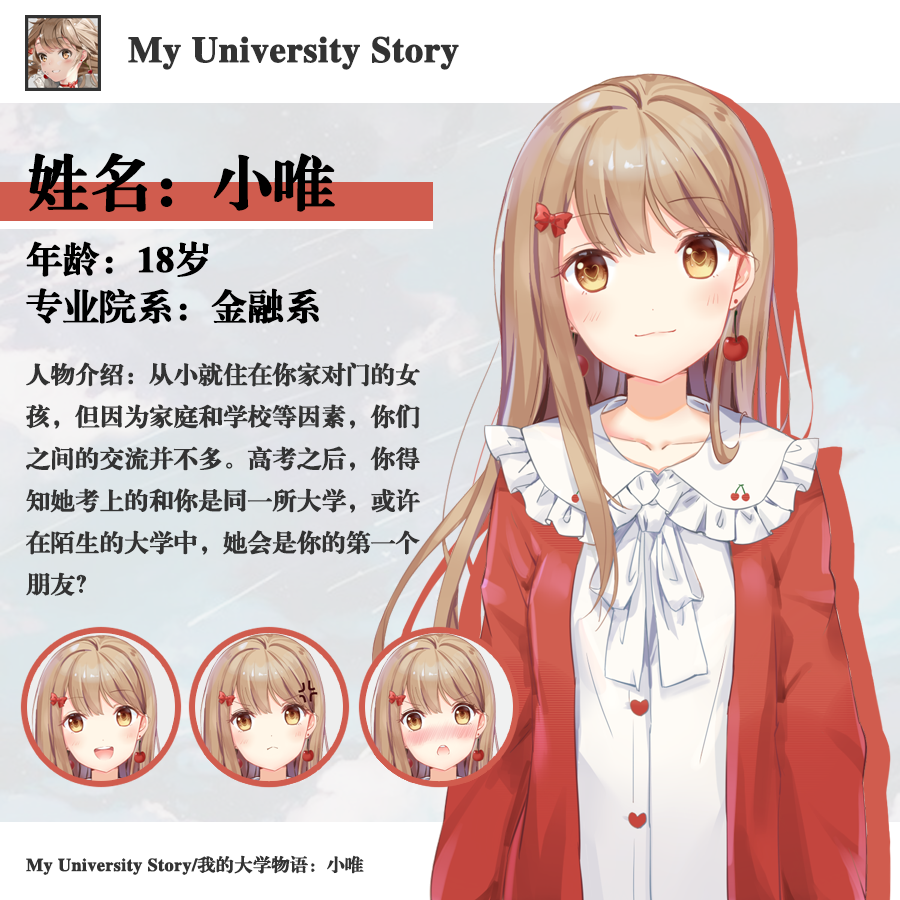 ·新增了宣传视频和宣传图片,以便玩家了解游戏。 ·将发售日期和发行日期修正为正确时间(美国太平洋时间7.31日下午3:00,但到时候应该会争取提前到中国时间7.31日发售。) ·游戏即将推出的是测试版本,很多系统与机制都采用了临时设定的形式登场,在完善了所有开发细节之后,这些机制将被更为复杂和有趣的全新系统所代替。 ·本游戏的侧重点在于:倾向于开发NPC的人工智能,让人物与玩家的好感可以改变其他人物的选课路线,让玩家的选项影响到其他人物的行动和判断,甚至触发人物向玩家主动打招呼的功能。 ·正式版本:在基础系统开发完毕之后,游戏将由测试版转为正式版,并加入一个限时免费的DLC,内容至少包括一个新人物。 ·后续制作:后续将根据实际情况,考虑制作舍友系统,女性向系统,包括女性主角和其他男性人物,以及社团系统等。 ·结尾:暂时想到的只有这些,感谢各位一路上对于《My Univerisity Story/我的大学物语》的关注。