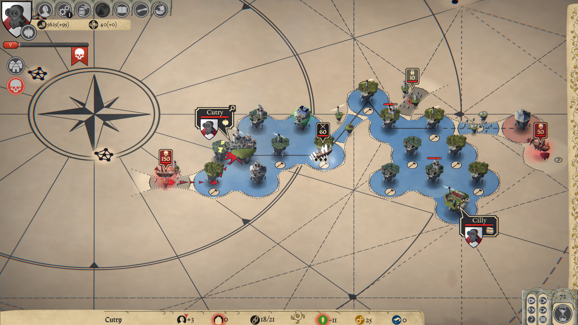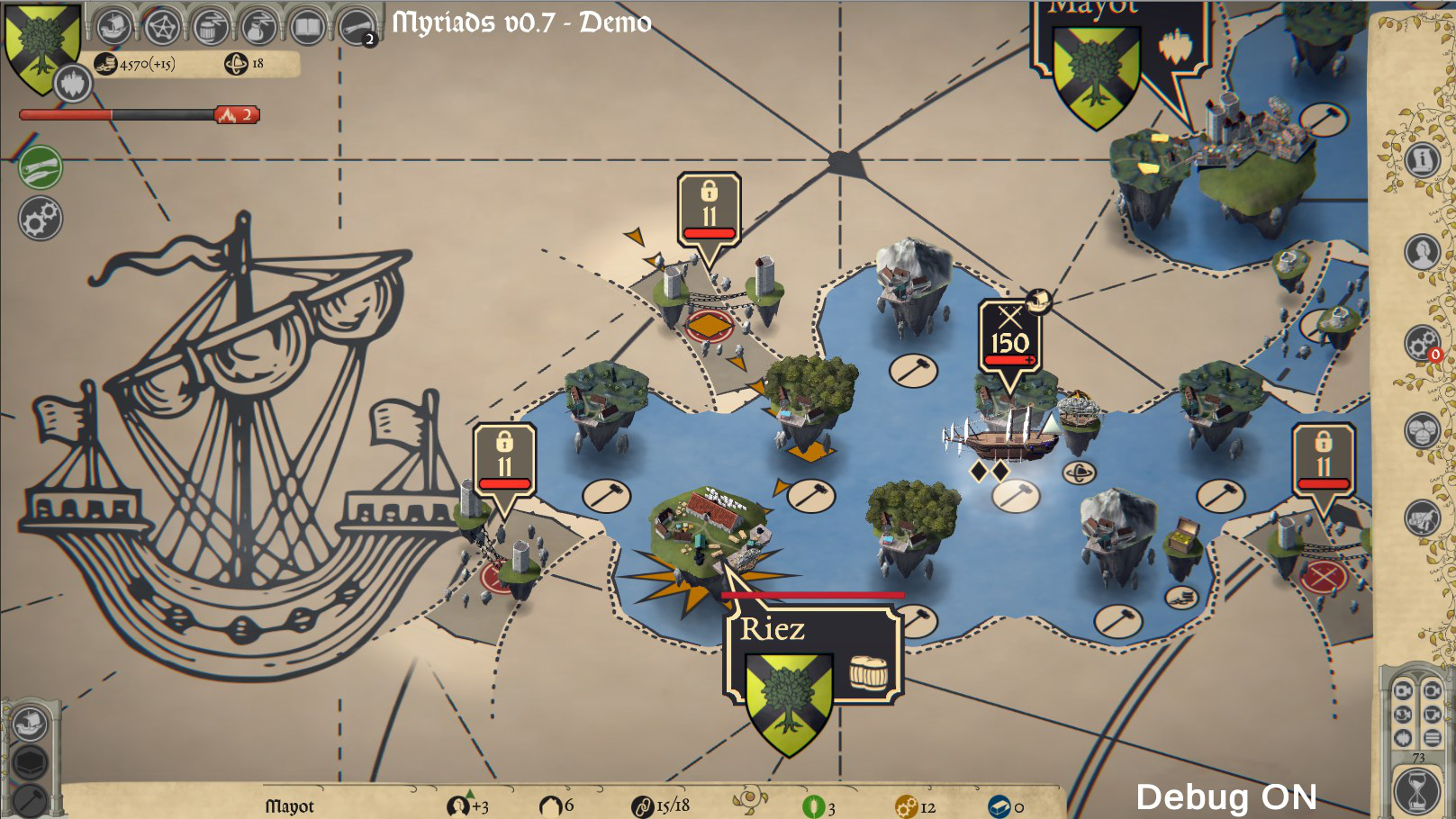 Threat (50%): the base mechanic of the threat is implemented. As time passes the threat increases (some player actions also increase the threat). For now, each time it reaches 100, the threat level will increase and the Chain’s corsairs and lairs get more powerful. In the future, every n levels (n to be determined) a big wave of enemies will aim at the player’s capital island. Each wave will be very powerful and will have to be dealt with a strategic combination of “suicide armies” and defense towers.