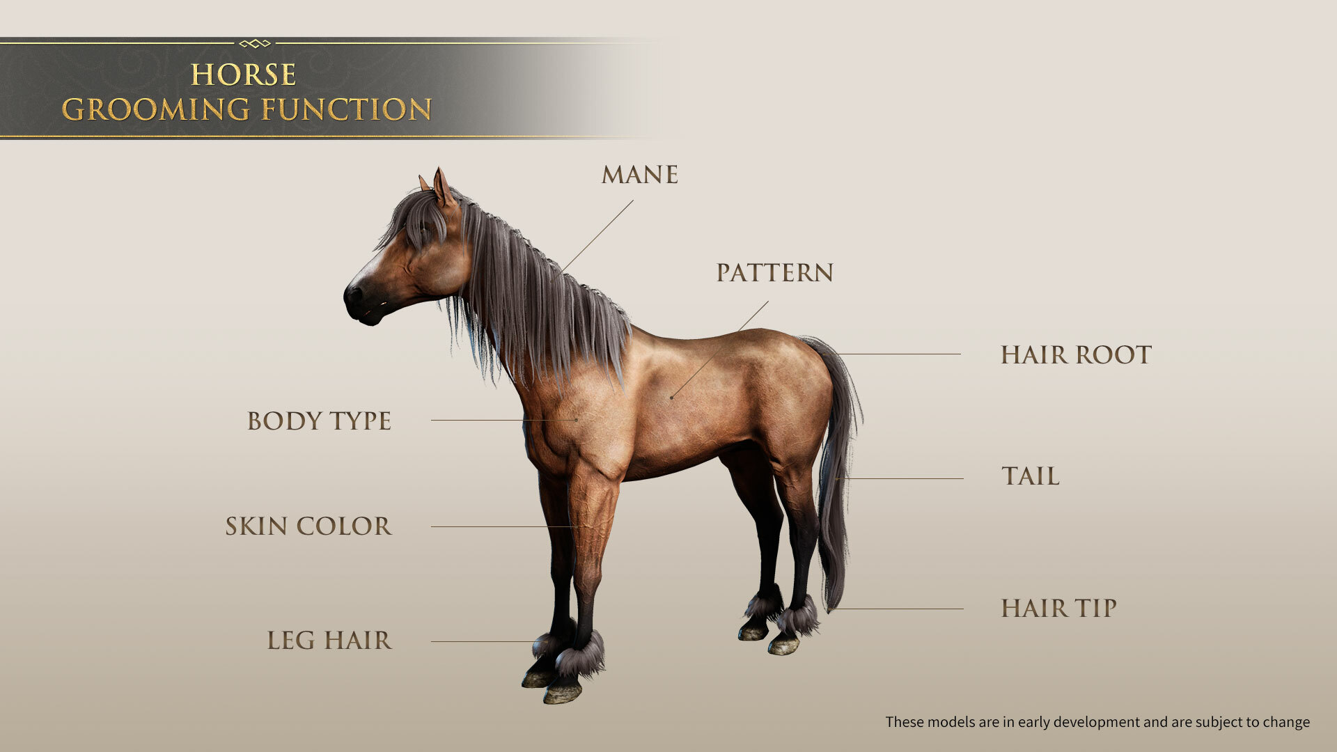 As for the horse grooming feature, players can use this function in the stable for a specific horse. The interface is similar to the character creation screen, allowing players to make detailed adjustments and modifications to the horse's color, body shape, patterns, mane, tail, leg hair, and even the roots and tips of the hair. Additionally, multiple pre-designed sets are provided for players to choose from, enabling them to customize their beloved horses to their heart's content and save the designs as templates. This feature will be introduced alongside the Persian Civilization DLC update, and all players will be able to enjoy it upon release.