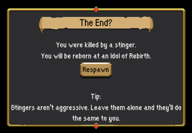 Added brand new death screen. Now, upon death, there will be a pop-up detailing what killed you as well as a relevant gameplay tip.