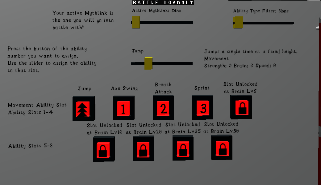 One somewhat unique aspect of Mythlink as a game is the idea that you can adjust your Mythlink's stats. We'll talk more about this next month, but simply put you can purposefully make your Mythink weaker or stronger during setup. When you do so, this means certain abilities may become unavailable for you to equip. For instance, if you want to equip the "Energy Cannon" ability, which requires 11 strength, but you only have 10 strength assigned, you won't be able to equip that ability. You can still read what it does and see the requirements, but the little padlock icon shows that it cannot be equipped with your current stats.